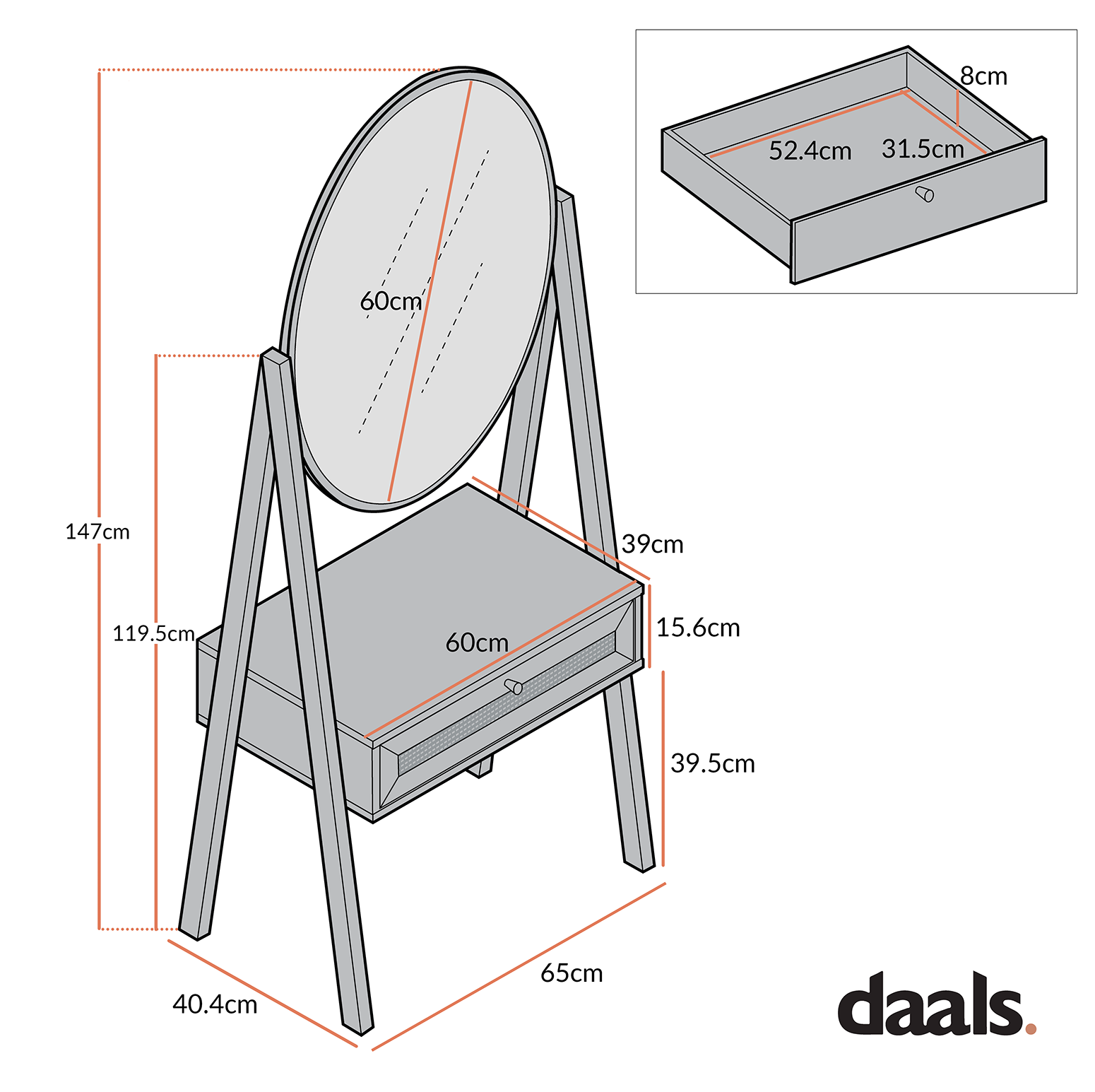 - Avec un miroir attaché de 60 cm de large, cela améliore encore le design minimaliste de la coiffeuse Frances