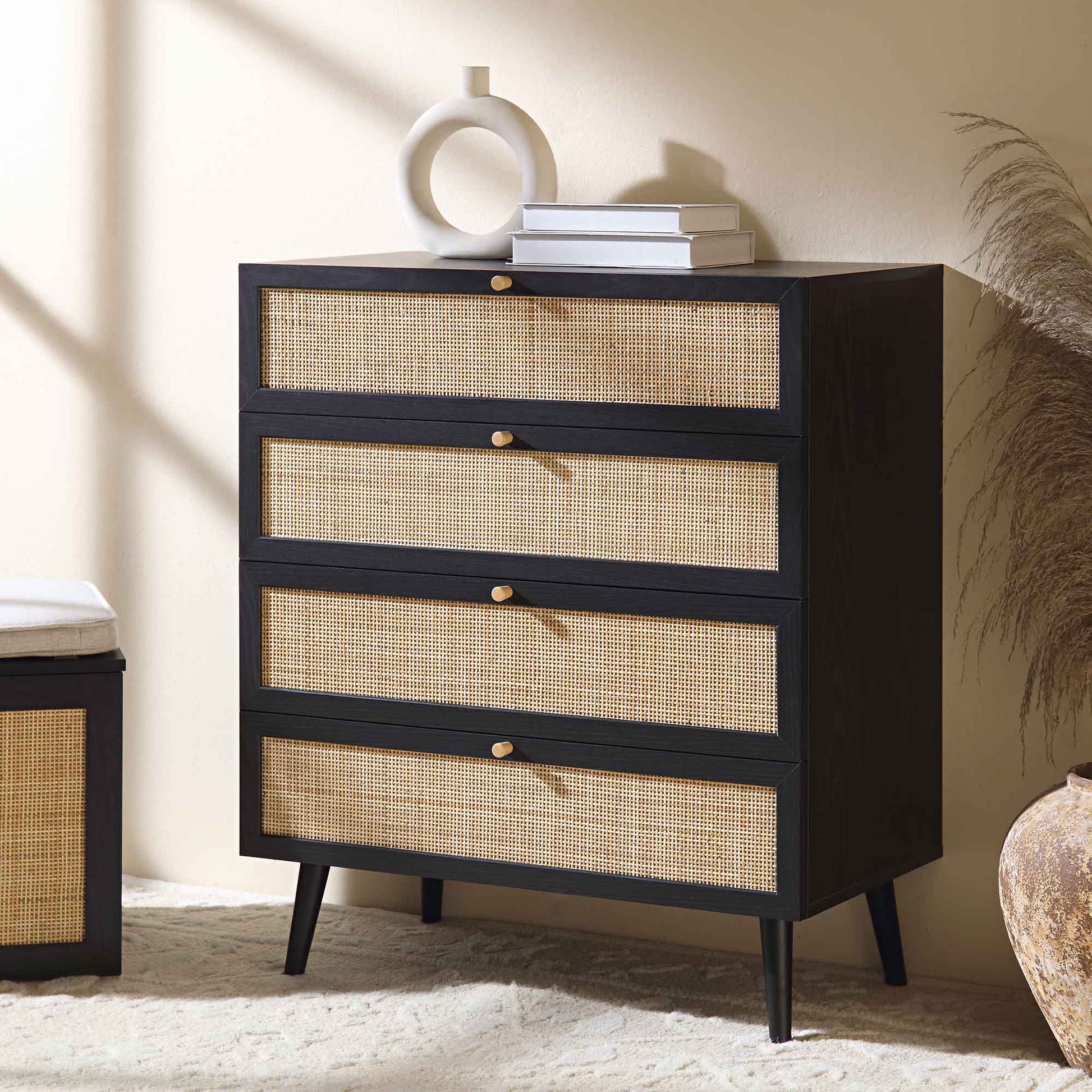 Commode haute 4 tiroirs en rotin tressé Frances, noire
