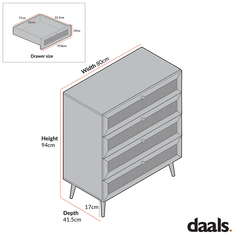 - Cette belle commode comprend quatre tiroirs spacieux, des tiroirs coulissants avec une façade de tiroir en rotin et des poignées en bois massif