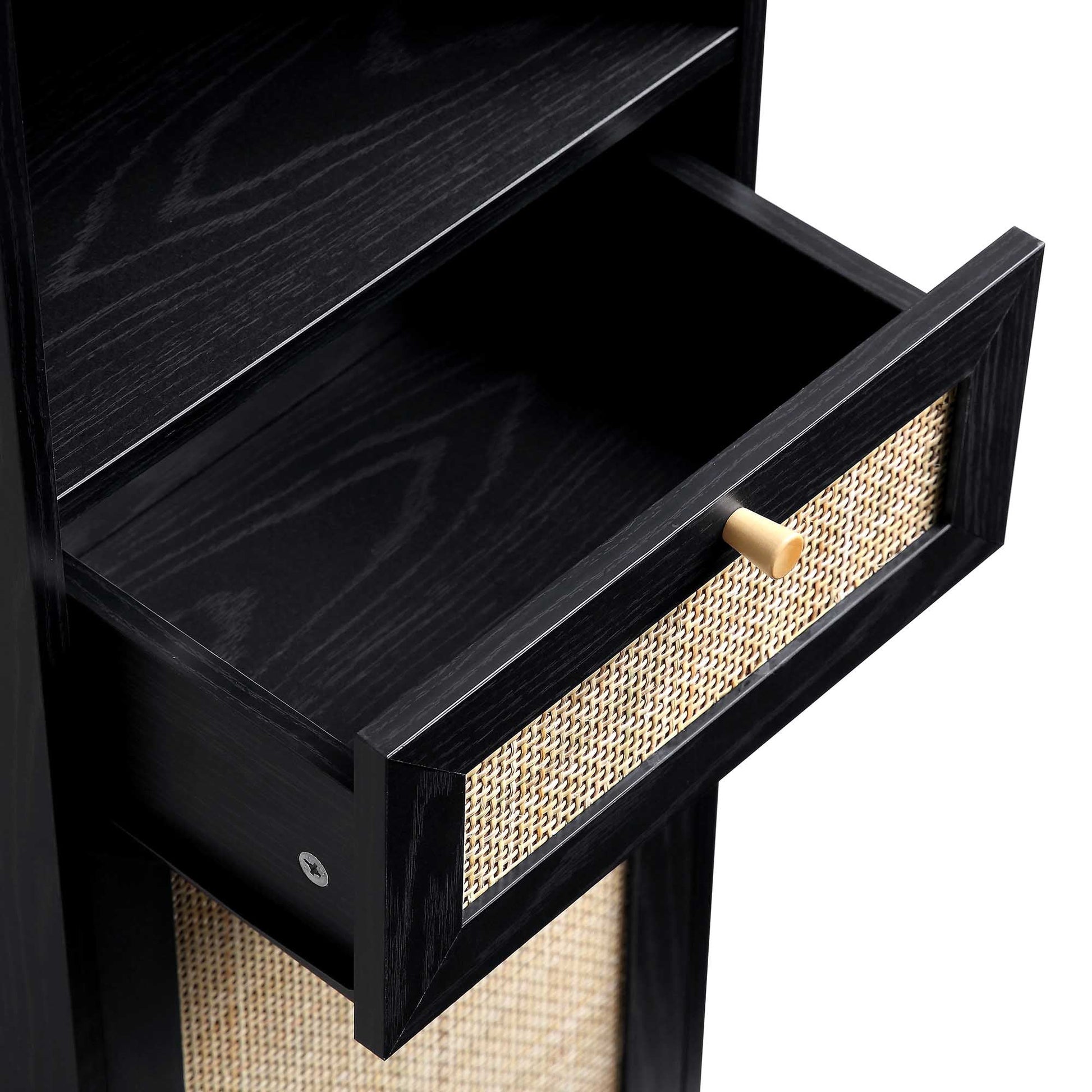 - Les portes et le tiroir en rotin sont complétés par une poignée en bois massif, ajoutant à la nature minimaliste de l'unité