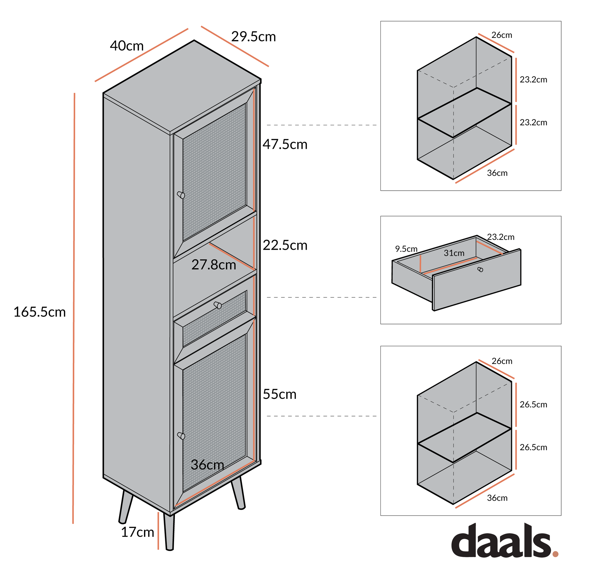 - Dimensions hors tout : L 40 x P 29,5 x H 165,5 cm