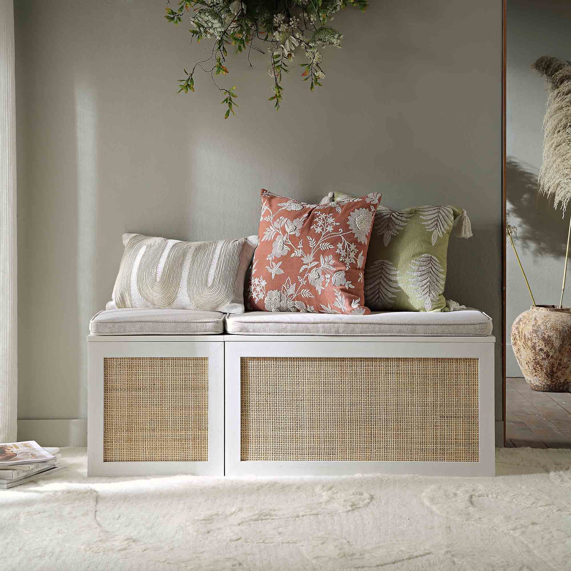 - Complétez le look : sur la photo avec notre tabouret de rangement triple en rotin tissé Frances, vous trouverez notre tapis en laine de Nouvelle-Zélande touffeté à la main Mirage , le coussin en velours côtelé scintillant Odilla de la collection Luxe , le coussin floral de la collection Aubrey et notre coussin Green Palms de la collection Vine.