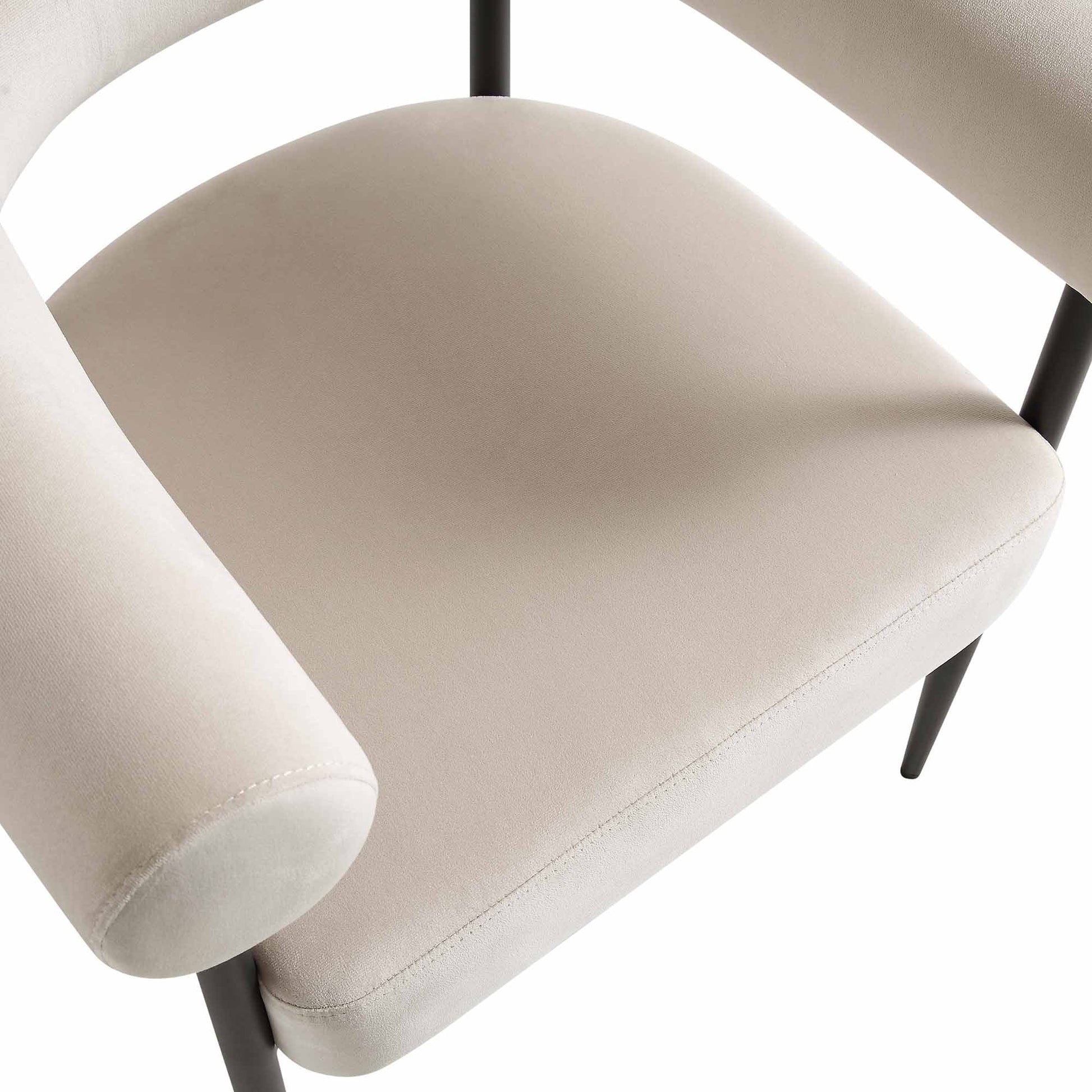 - Un siège bien rembourré et un somptueux revêtement en velours de couleur beige champagne rendent la chaise idéale pour une décoration de salle à manger contemporaine.