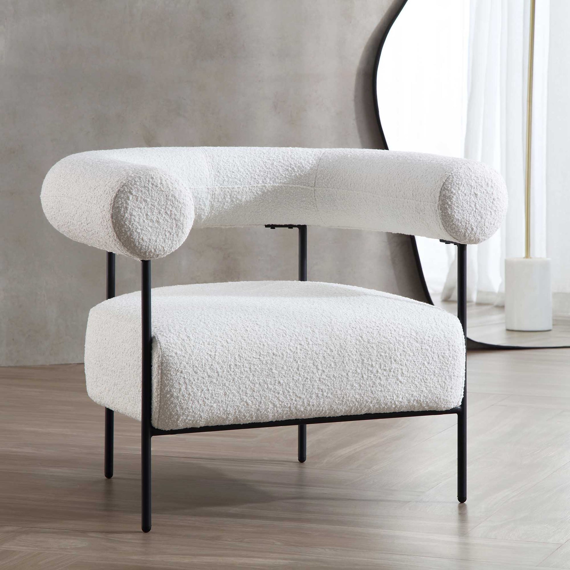 - Un siège bien rembourré et un magnifique tissu bouclé blanc font de cette chaise une pièce maîtresse accrocheuse pour votre pièce.
