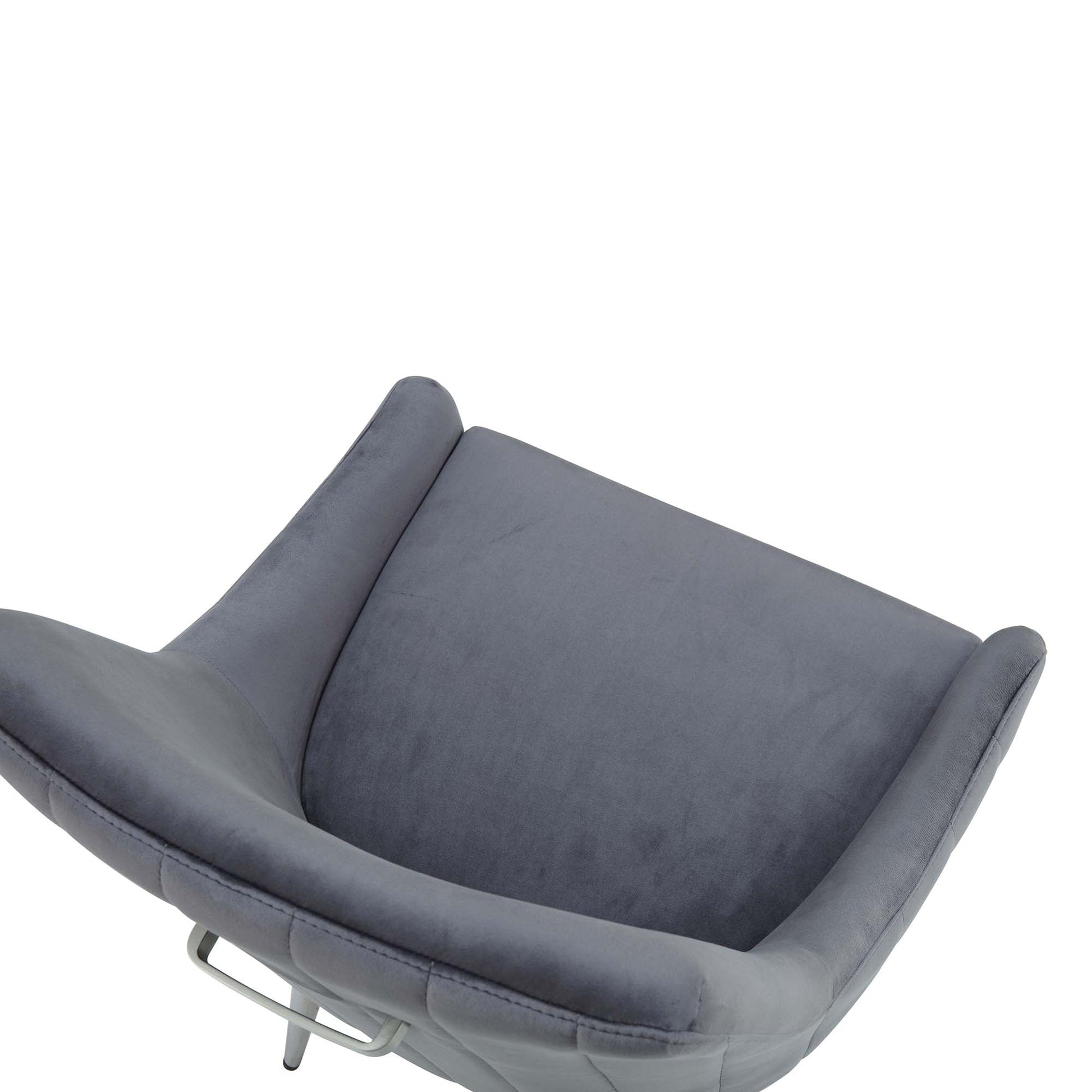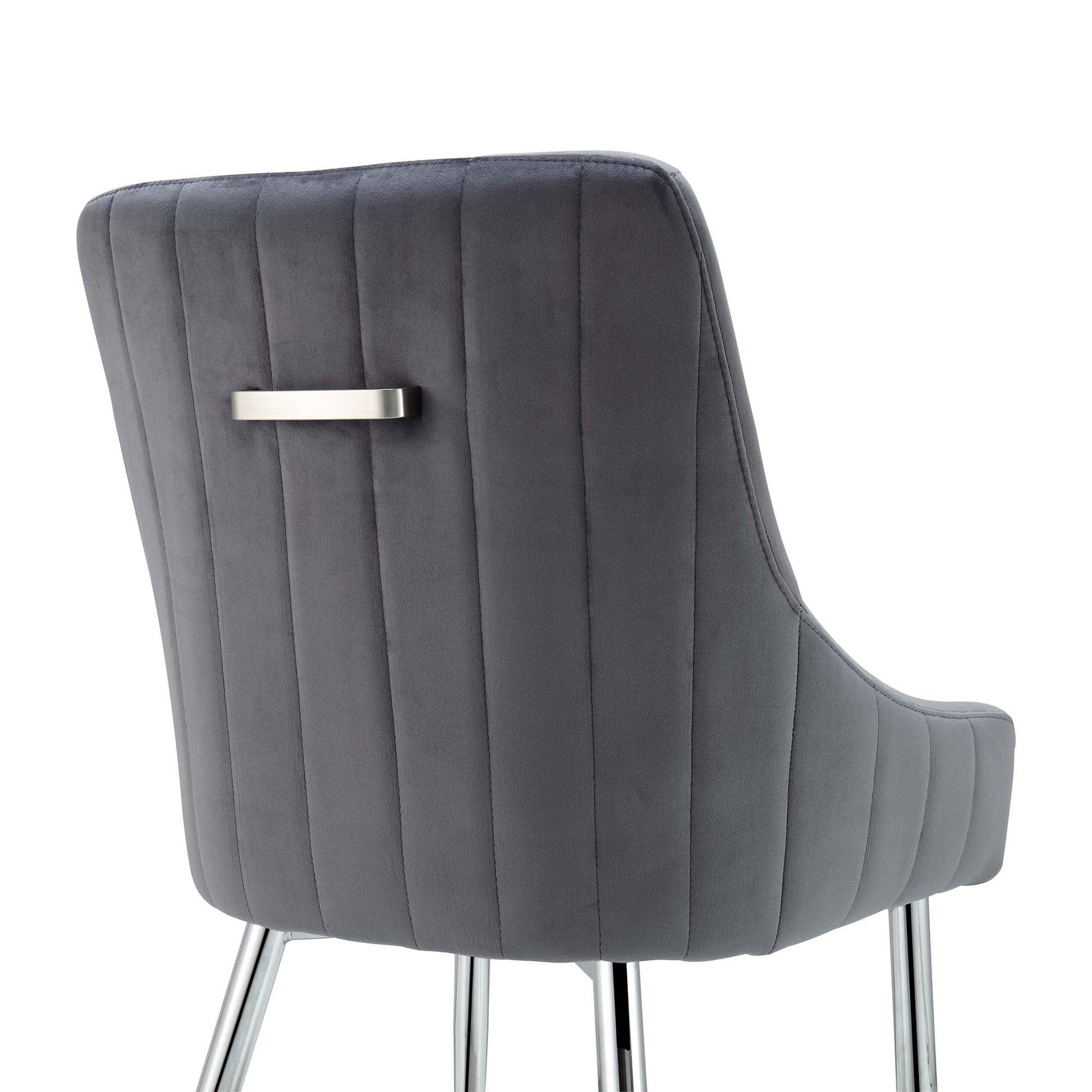 - Dotées d'un dossier cannelé et de pieds et poignées chromés, les chaises sont recouvertes d'un tissu en velours moelleux de couleur gris foncé.
