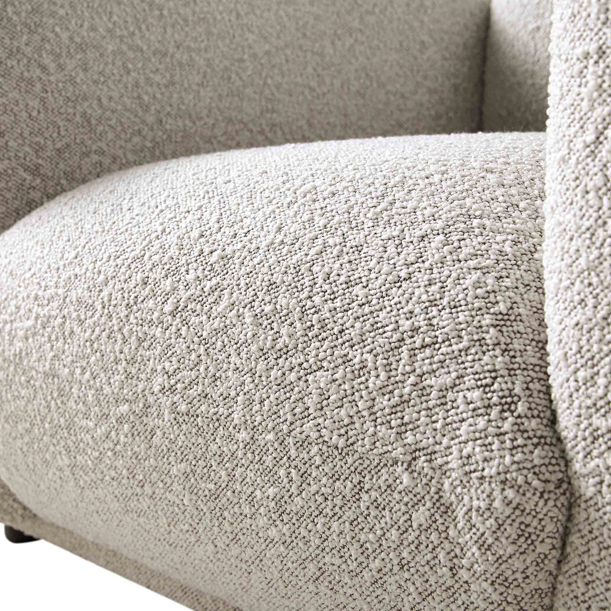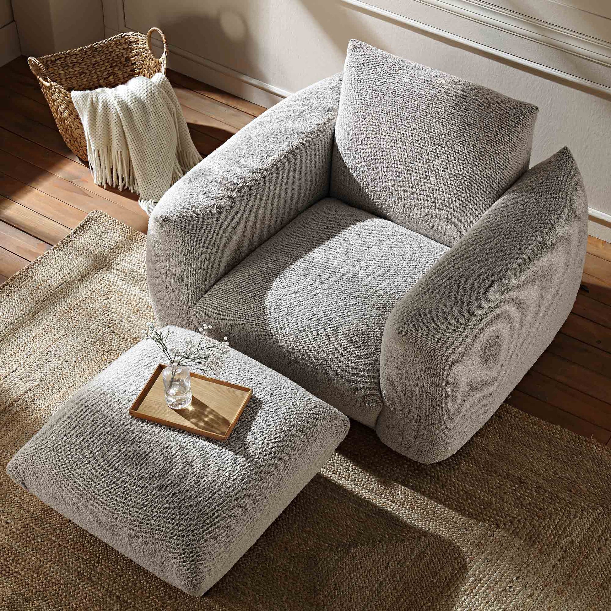 - Recouvert d'un tissu bouclé gris brume chic pour un look contemporain.