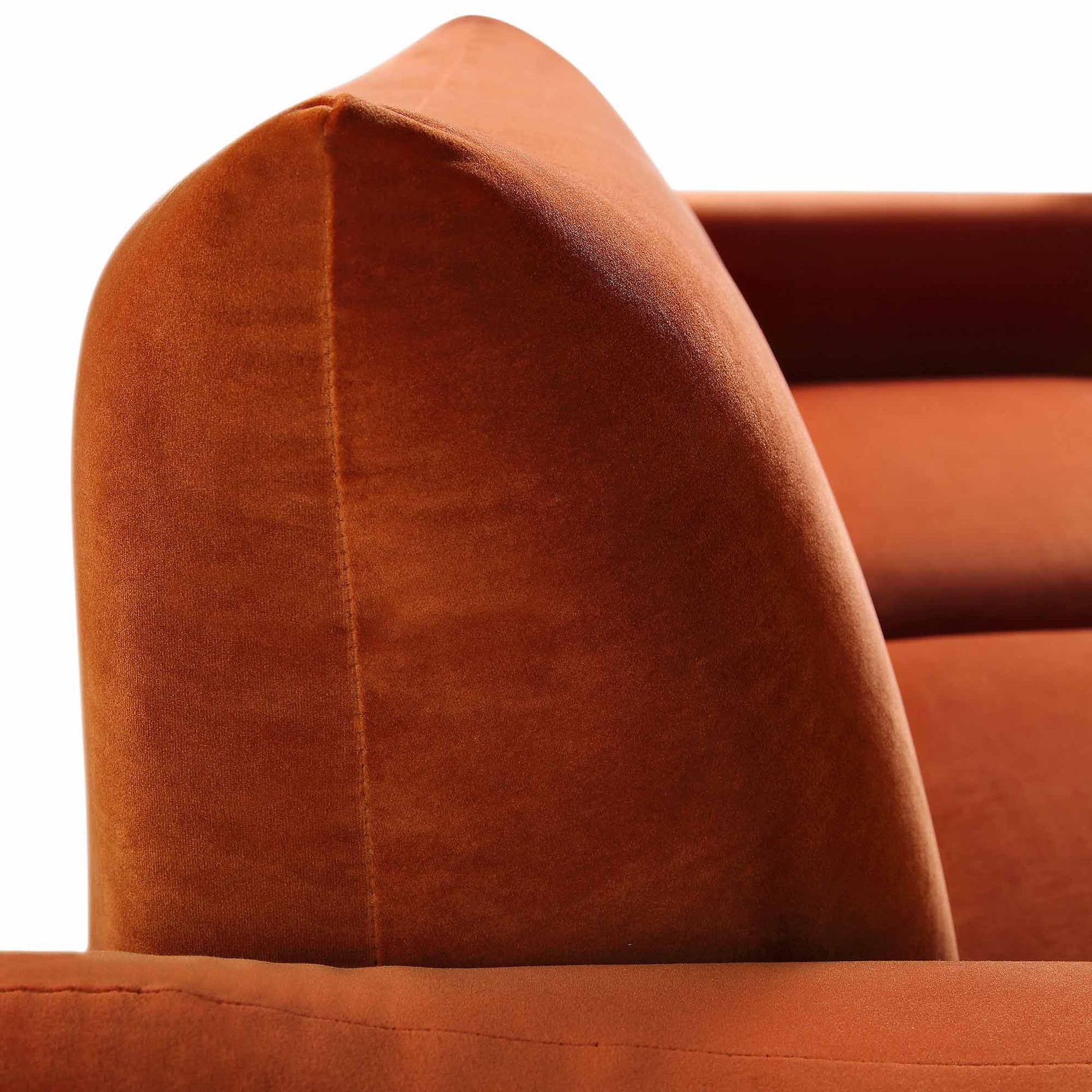 - Rembourré d'un tissu au toucher velours de couleur rouille riche.