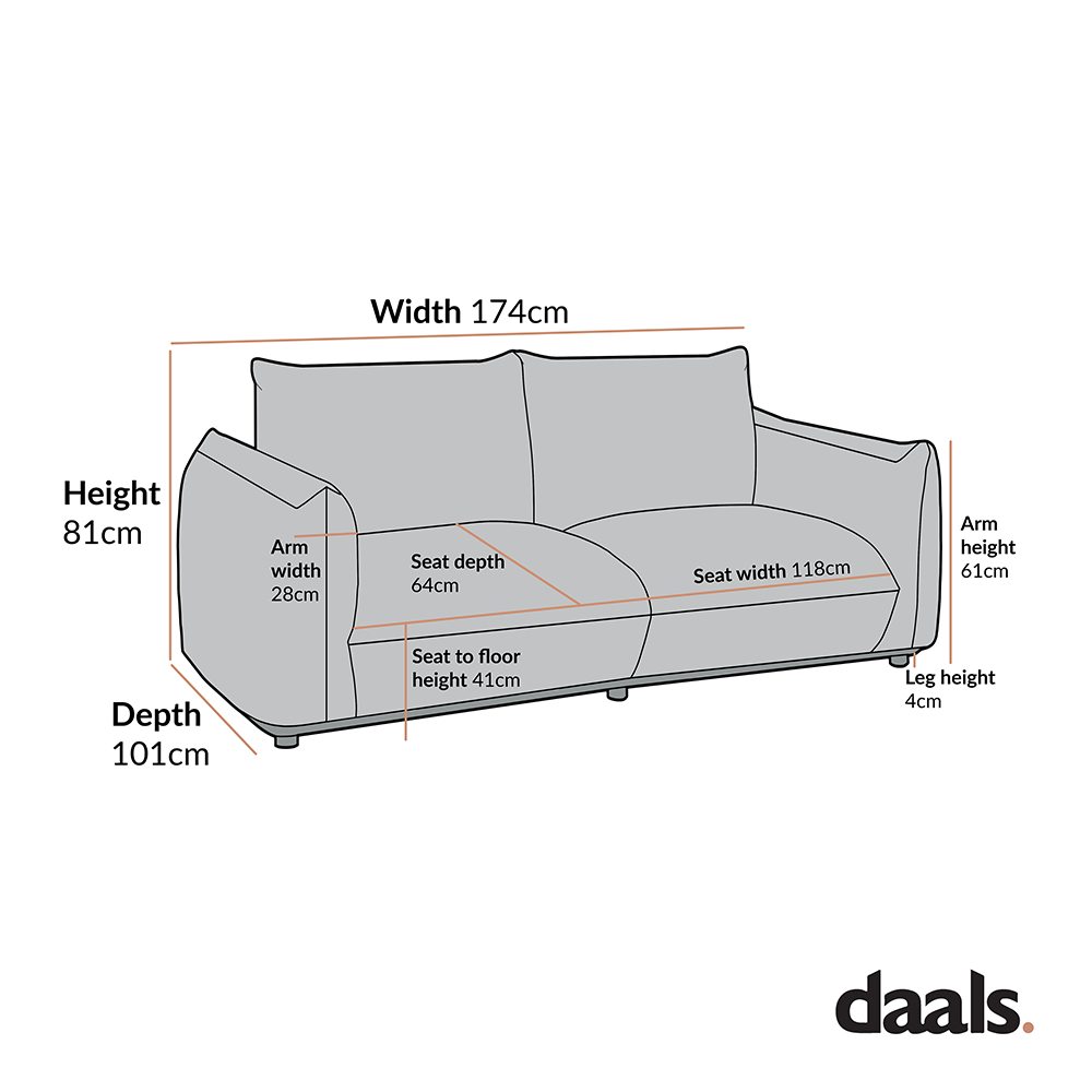 - Dimensions du canapé deux places : L 174 x P 101 x H 81 cm.