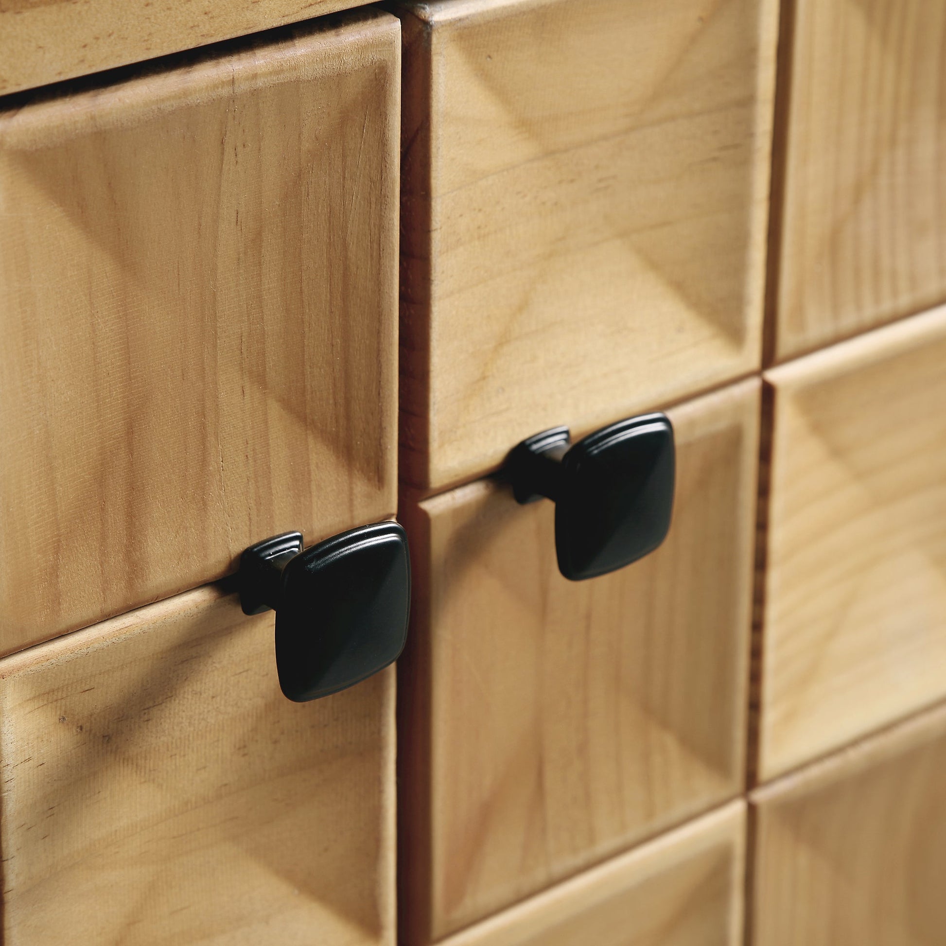 - Les façades des tiroirs à motifs carrés sont complétées par des poignées carrées noires.