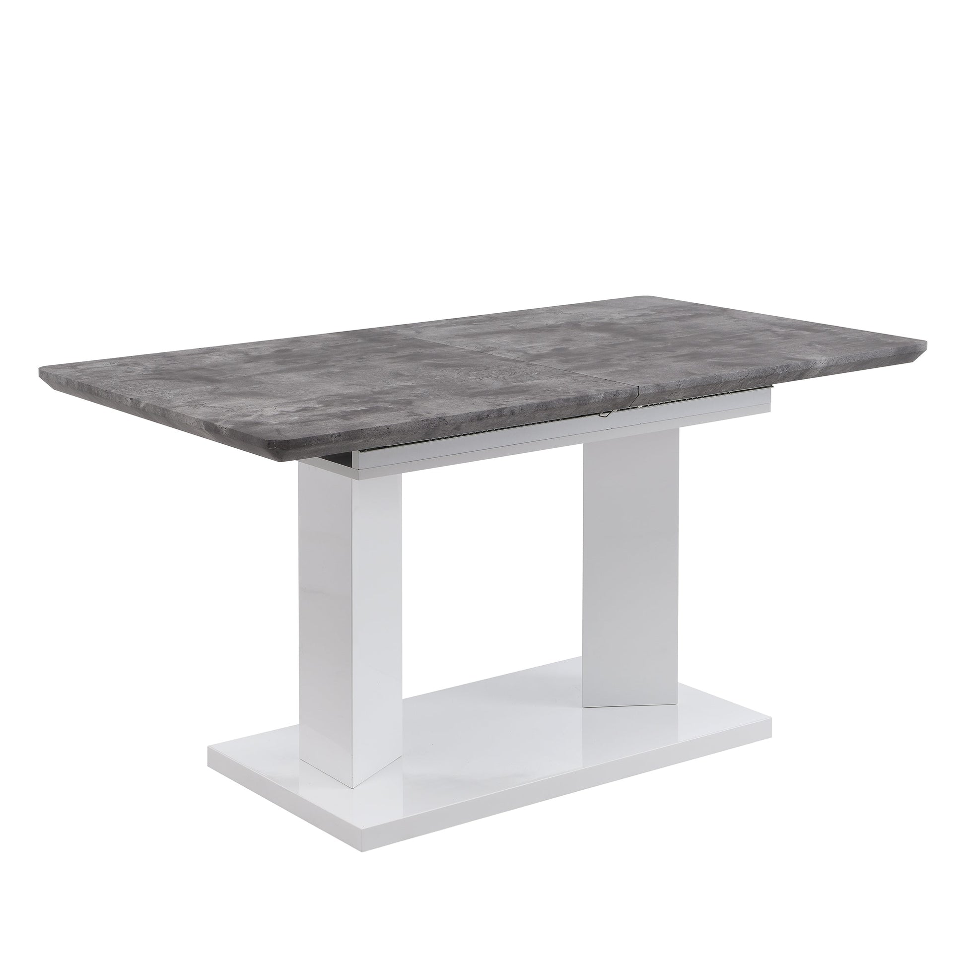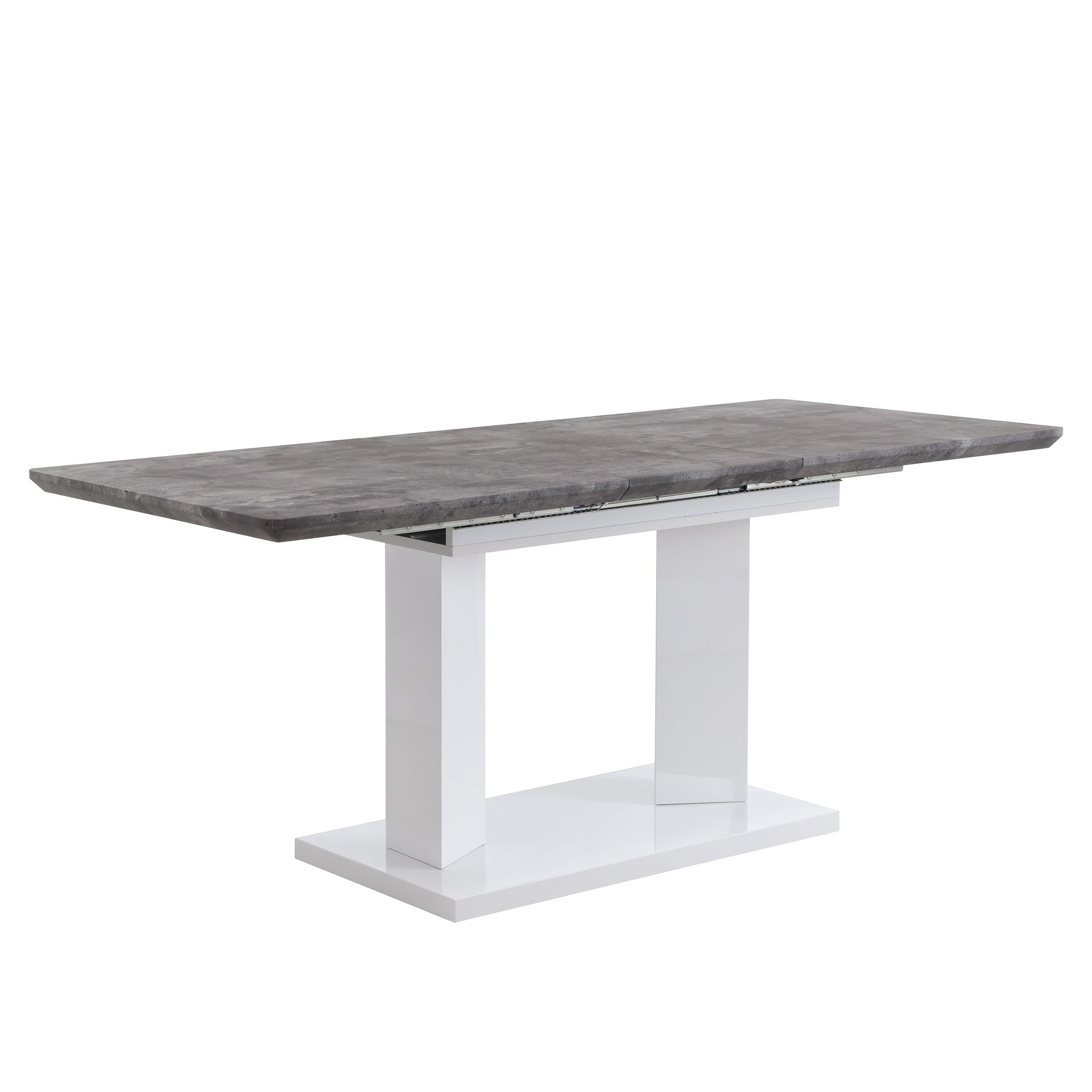 - Notre élégante table à manger Goswell arbore un design contemporain avec son plateau effet béton gris et son piètement blanc brillant. Elle est parfaite pour une cuisine/salle à manger ou une salle à manger décontractée.