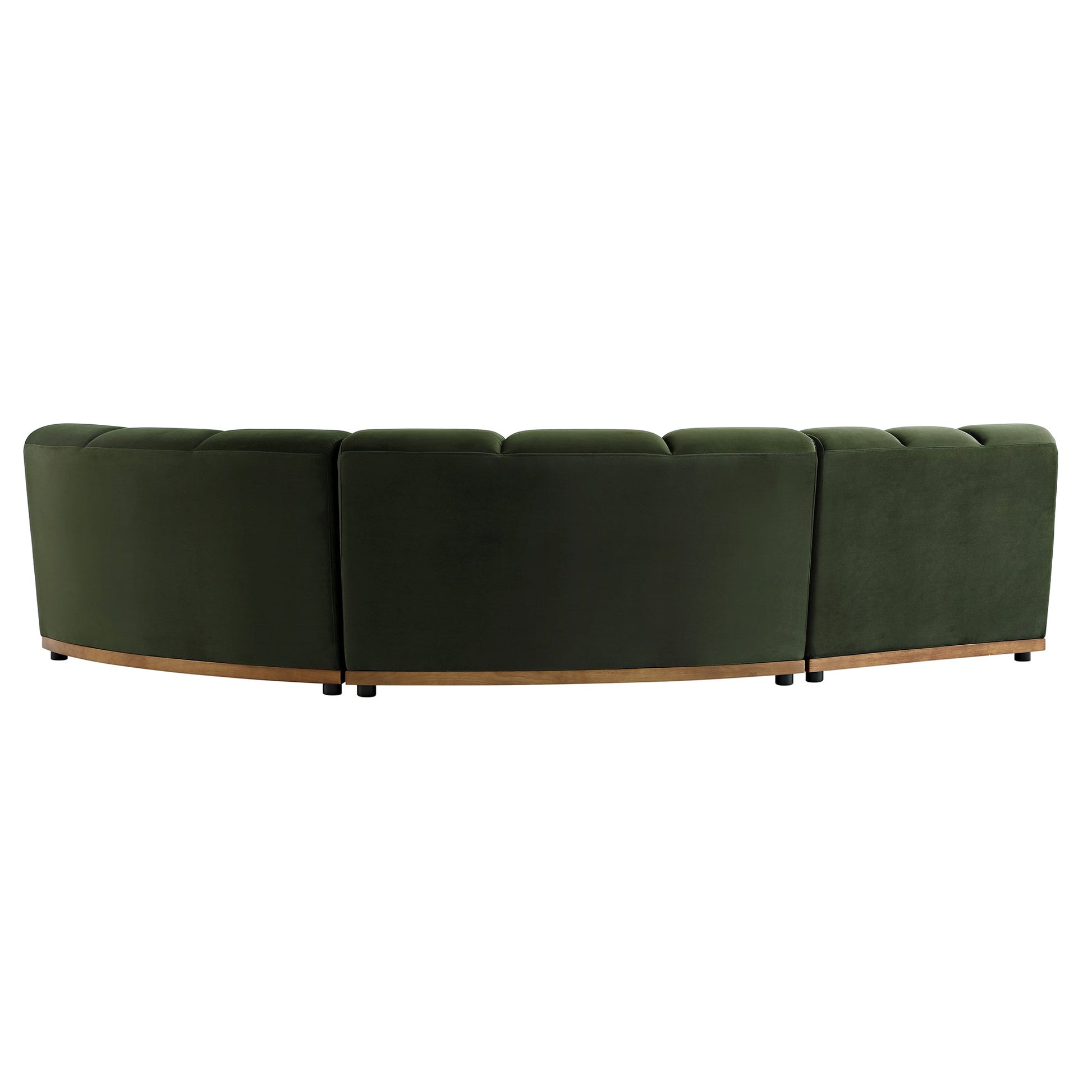 - Recouverts de velours vert mousse terreux, les modules du canapé sont montés sur des bases en bois massif teinté couleur noyer clair.