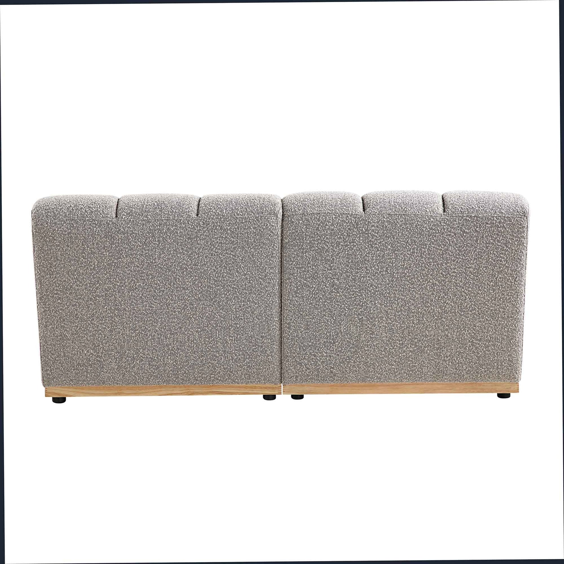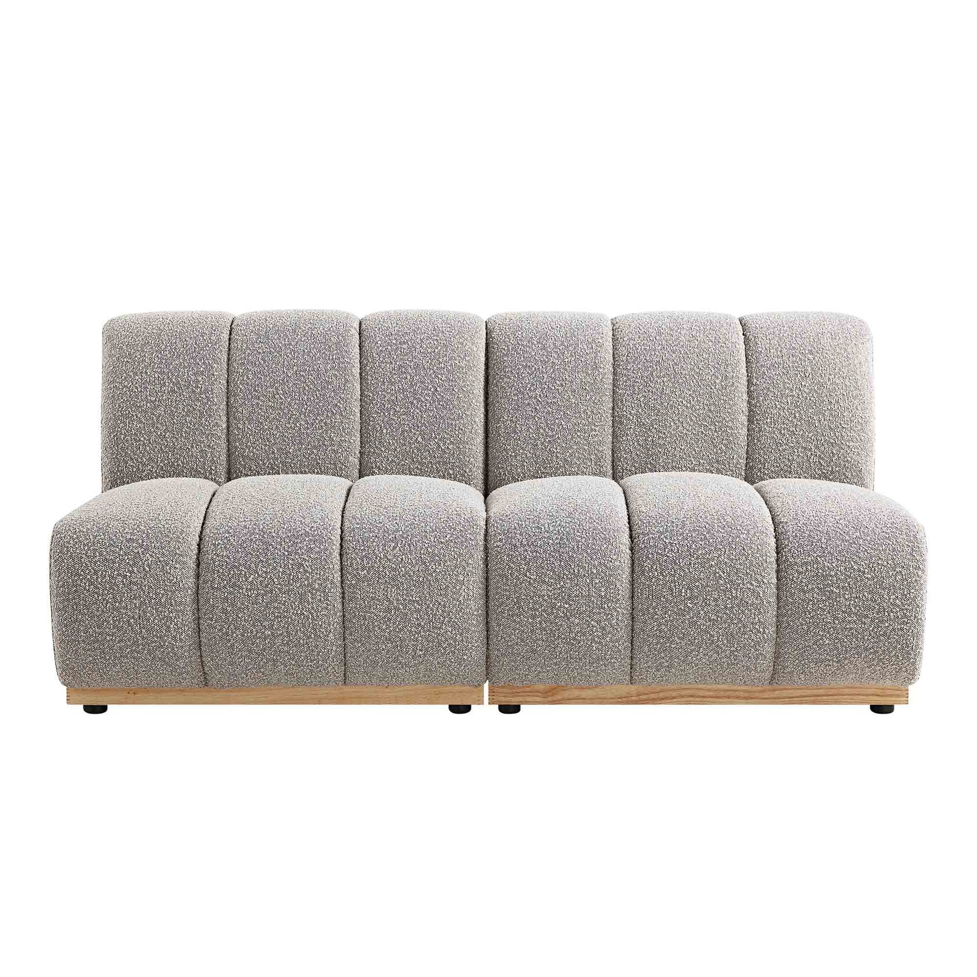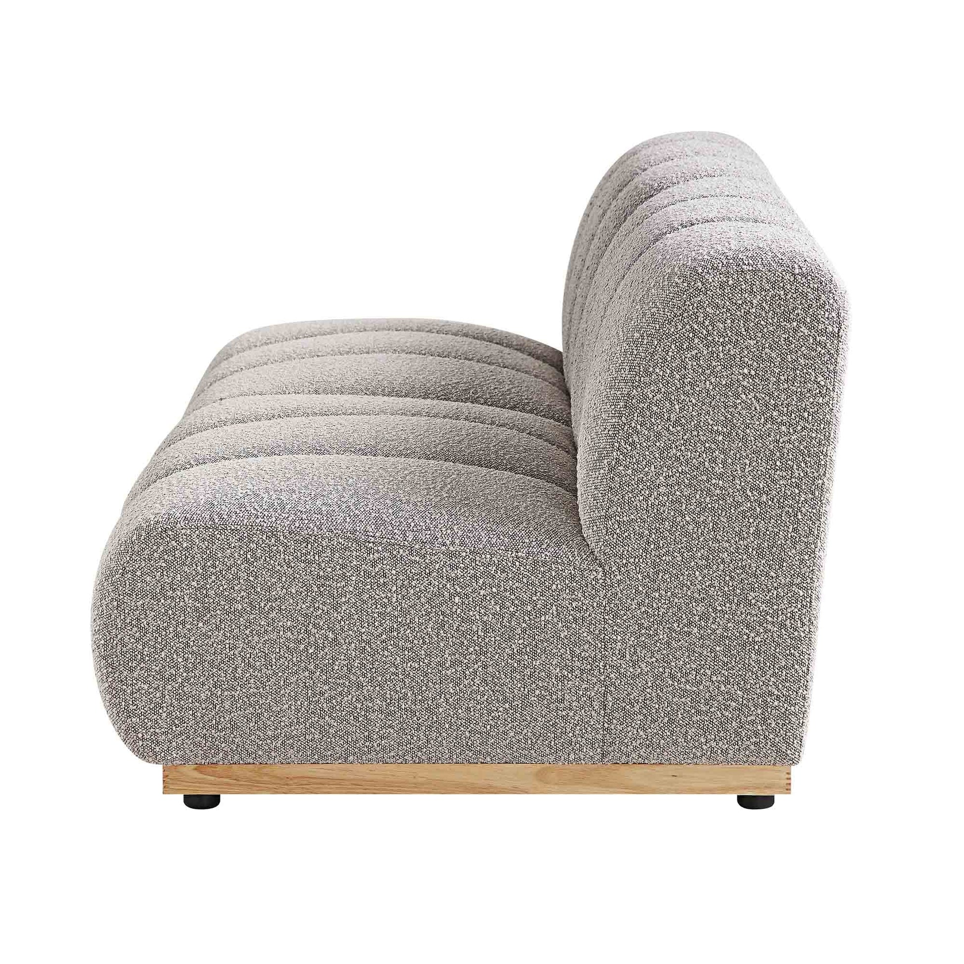 - Revêtus d'un magnifique tissu bouclé taupe, les modules de canapé sont montés sur des bases en bois massif naturel.