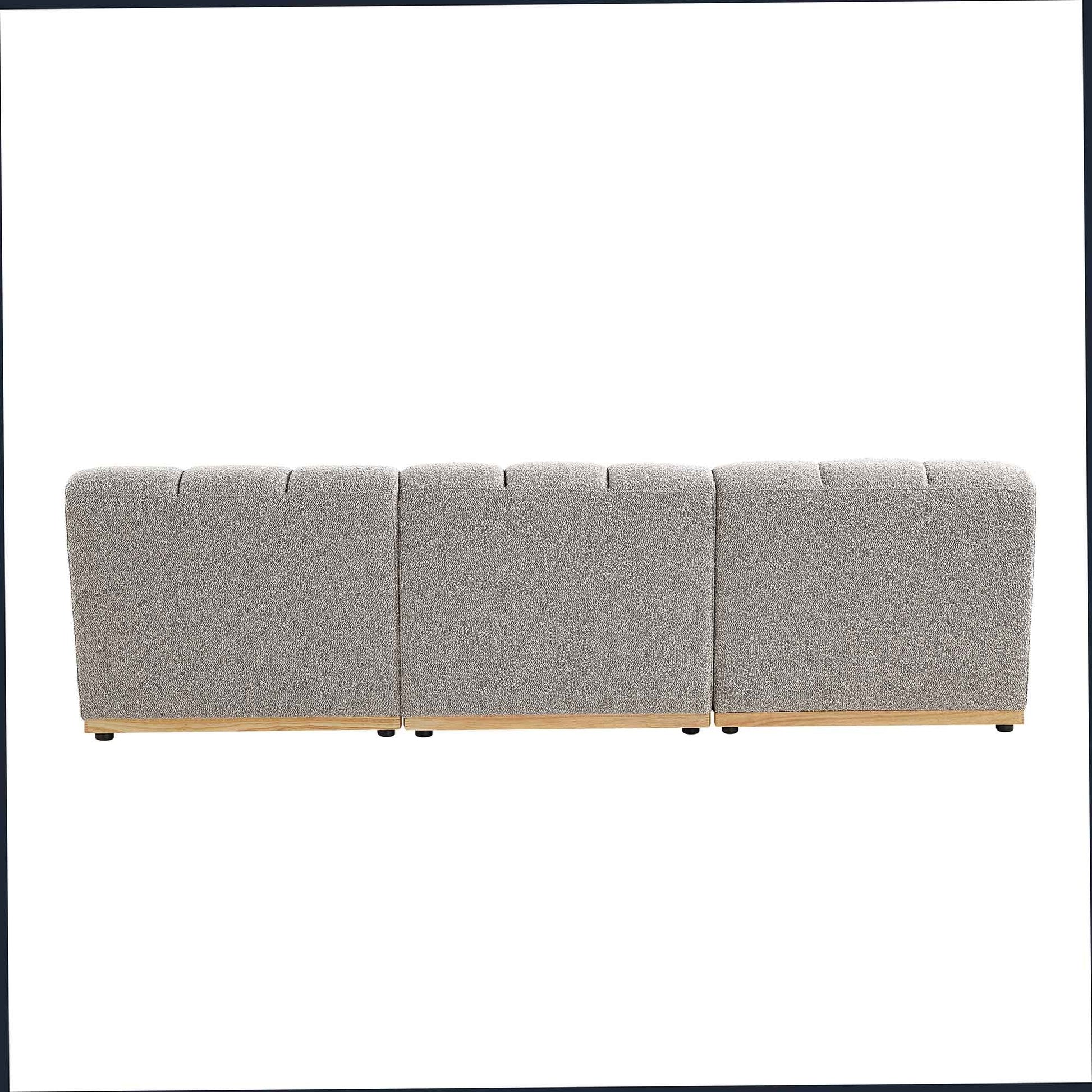 - Revêtus d'un magnifique tissu bouclé taupe, les modules de canapé sont montés sur des bases en bois massif naturel.