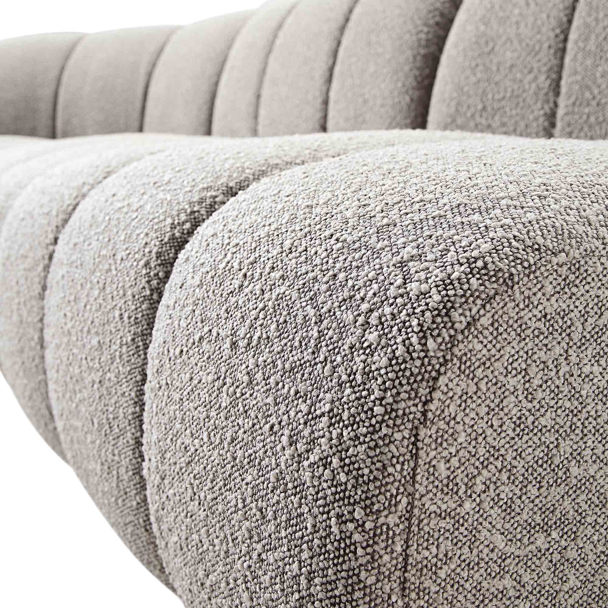- Revêtus d'un magnifique tissu bouclé taupe, les modules de canapé sont montés sur des bases en bois massif naturel.