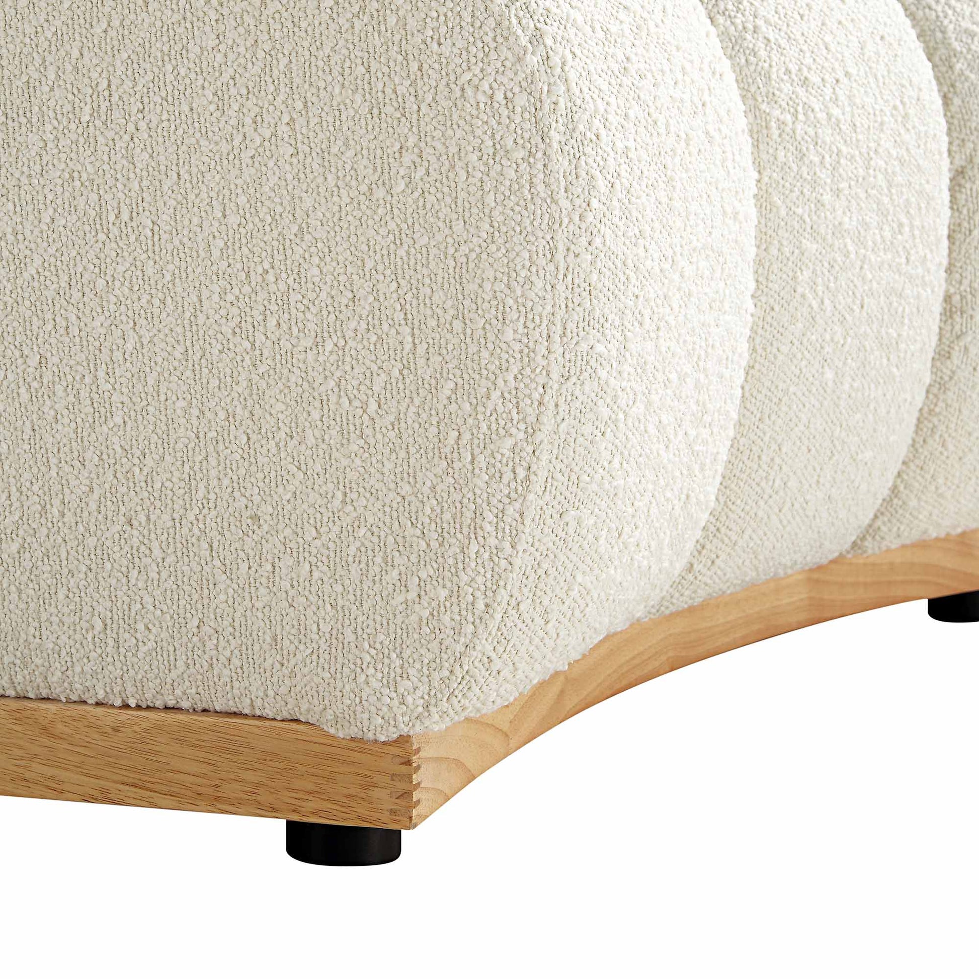 - Revêtus d'un magnifique tissu bouclé écru, les modules de canapé sont montés sur des bases en bois massif naturel.