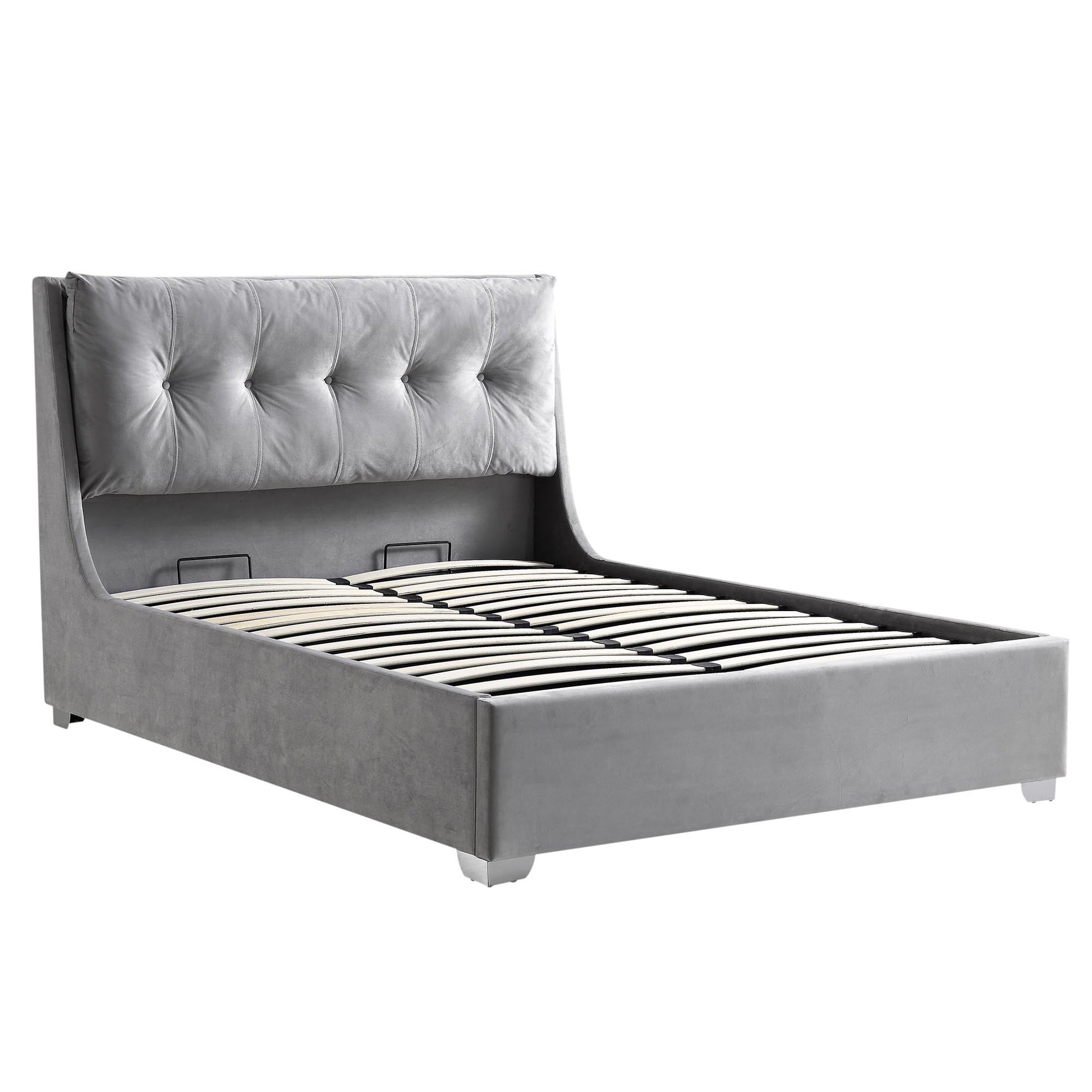 - Recouvert d'un tissu doux au toucher velours de couleur gris clair (qui ne peut jamais se tromper), le lit est doté de pieds d'angle chromés pour un look glamour moderne.