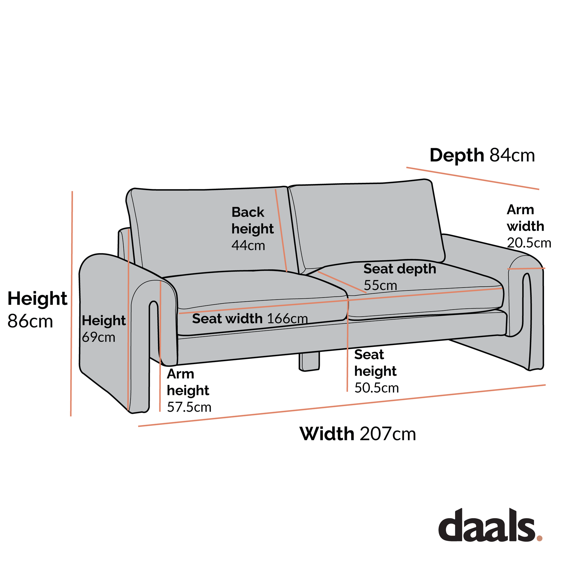 - Dimensions : L 207 x P 84 x H 86 cm. Hauteur d'assise : 50,5 cm.