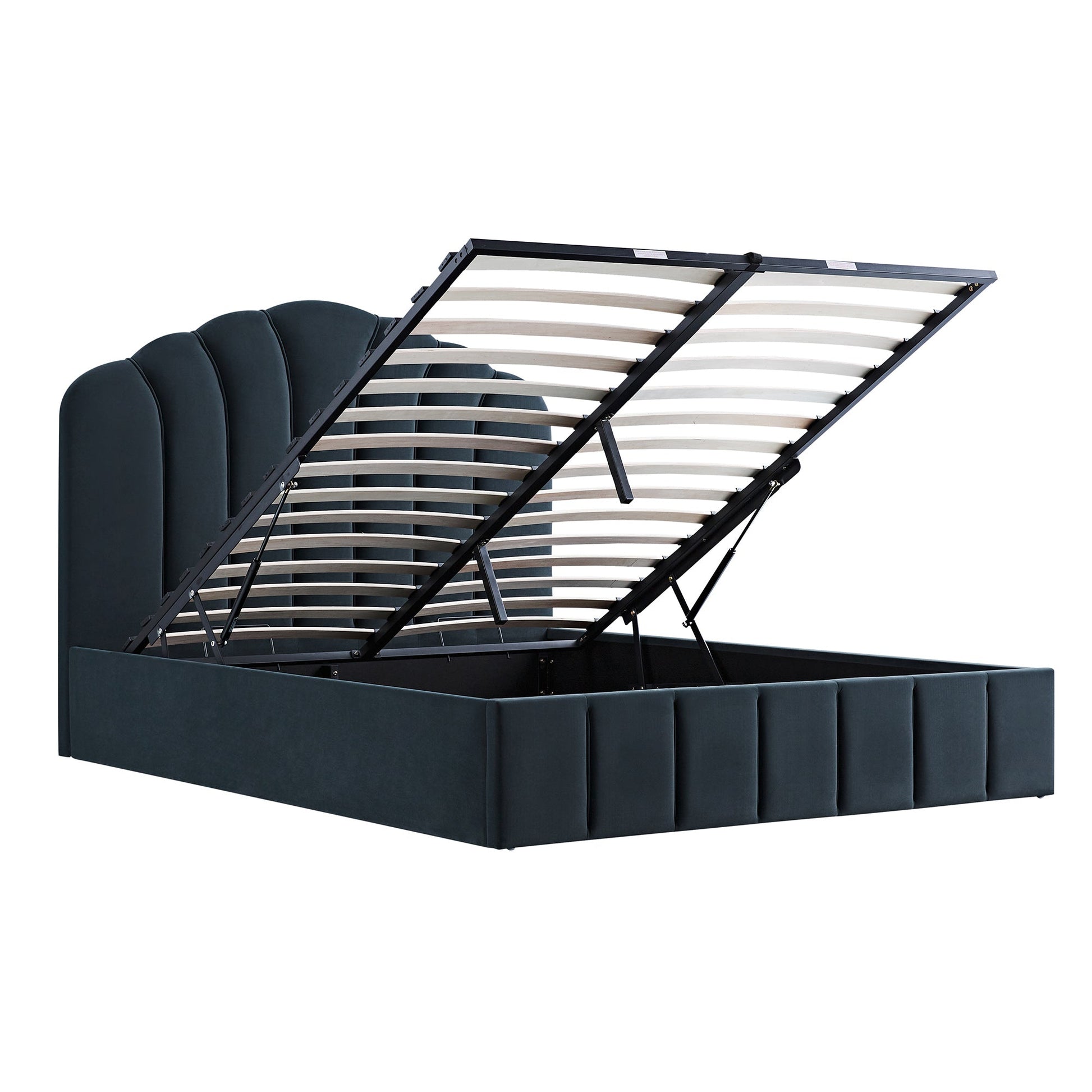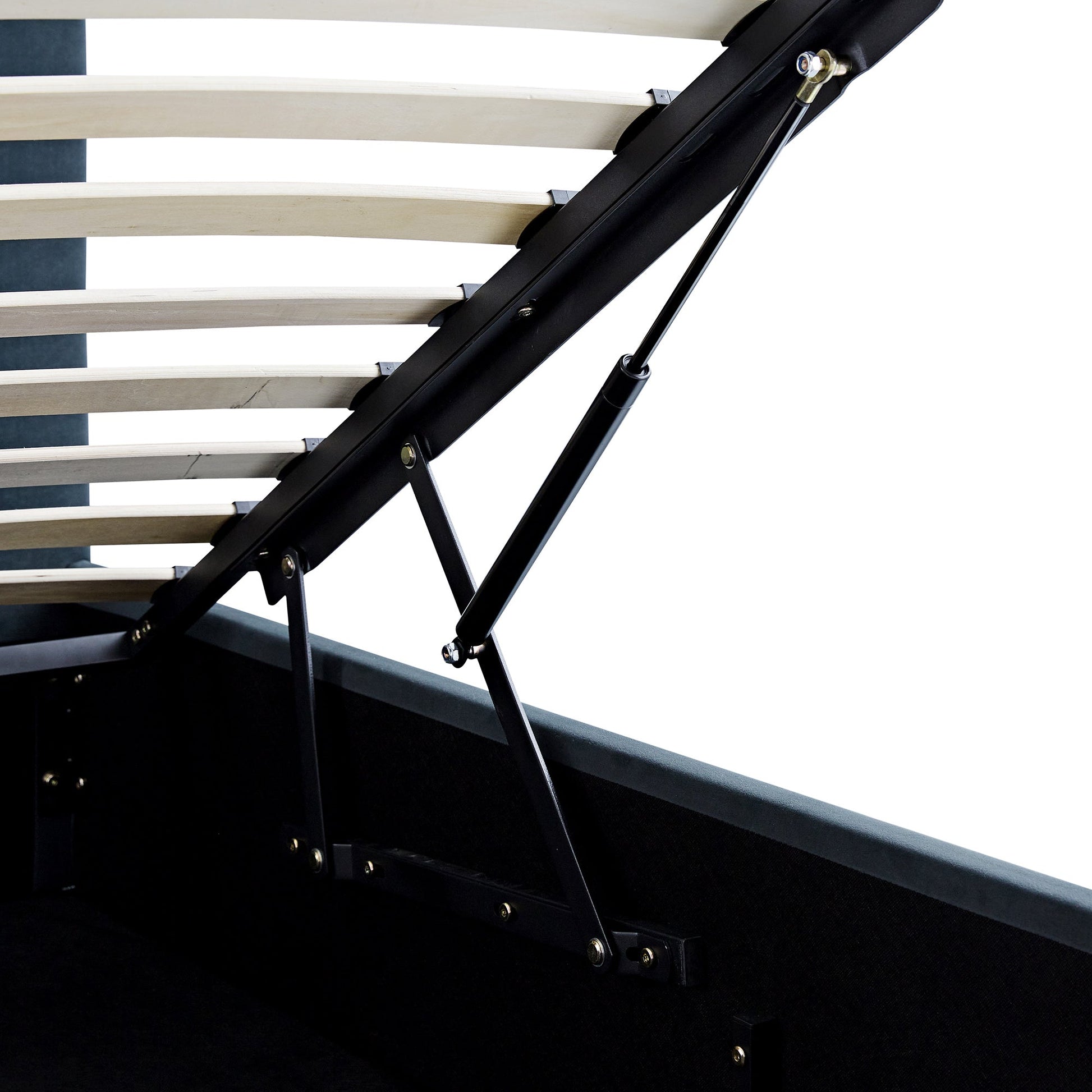 - La base soigneusement rembourrée cache un compartiment ottoman, accessible depuis l'extrémité du lit grâce à un mécanisme à vérin à gaz, offrant un rangement discret.