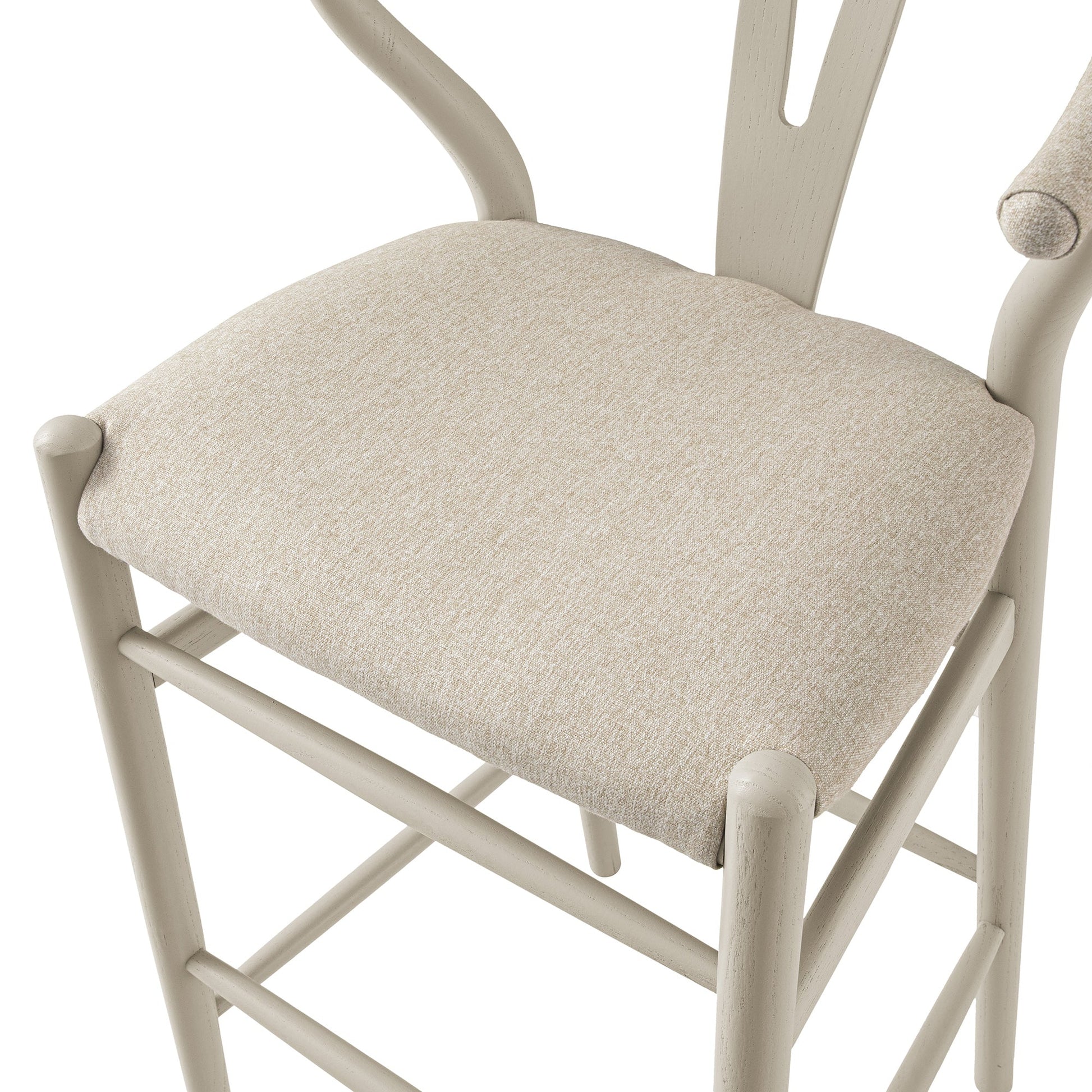 - Dotée d'un dossier en forme de Y, la chaise de bar est solidement fabriquée en orme massif avec une belle peinture mate de couleur grège, coordonnant le siège rembourré recouvert de tissu avoine.