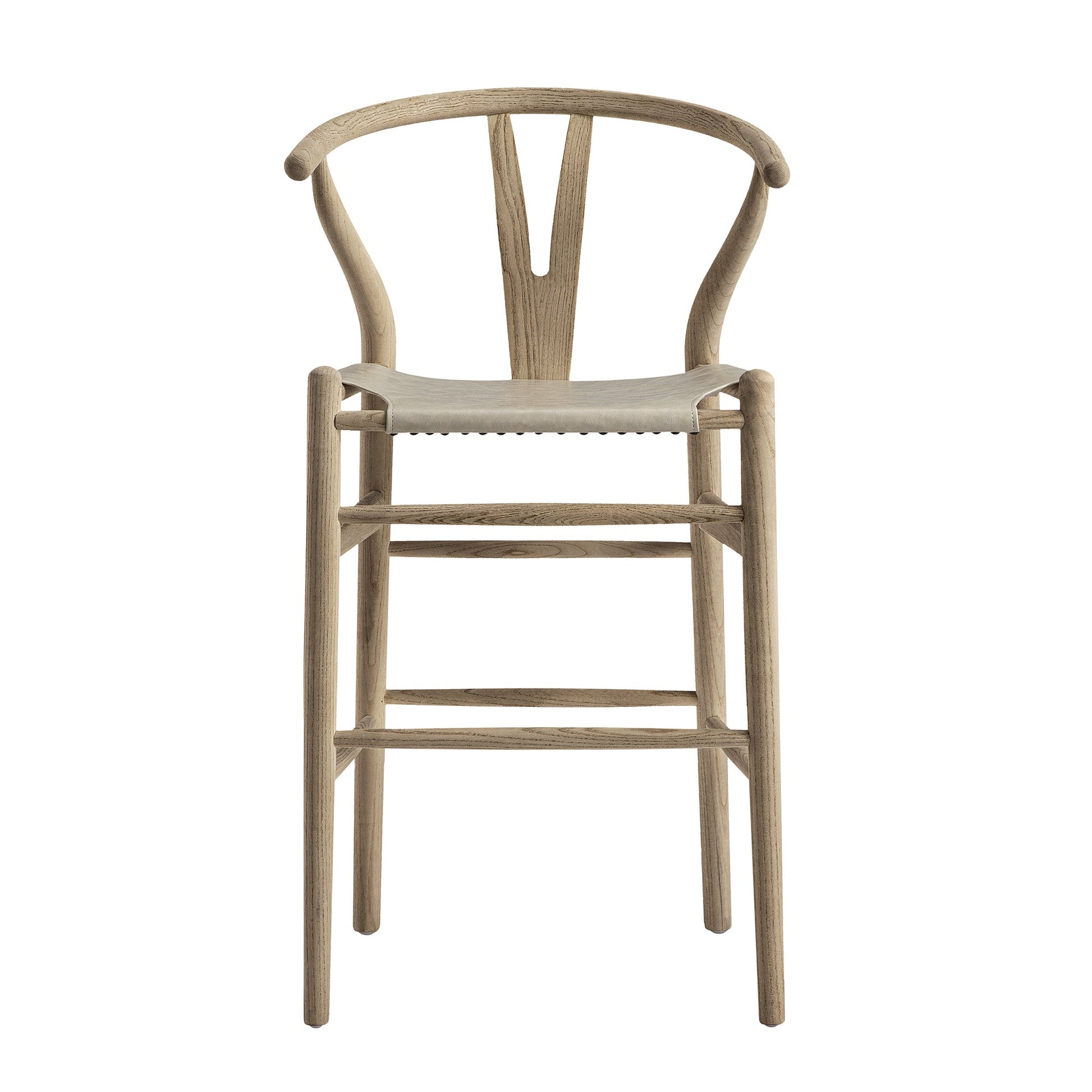 Tabouret de bar Hansel, structure en orme patiné et assise en similicuir gris clair