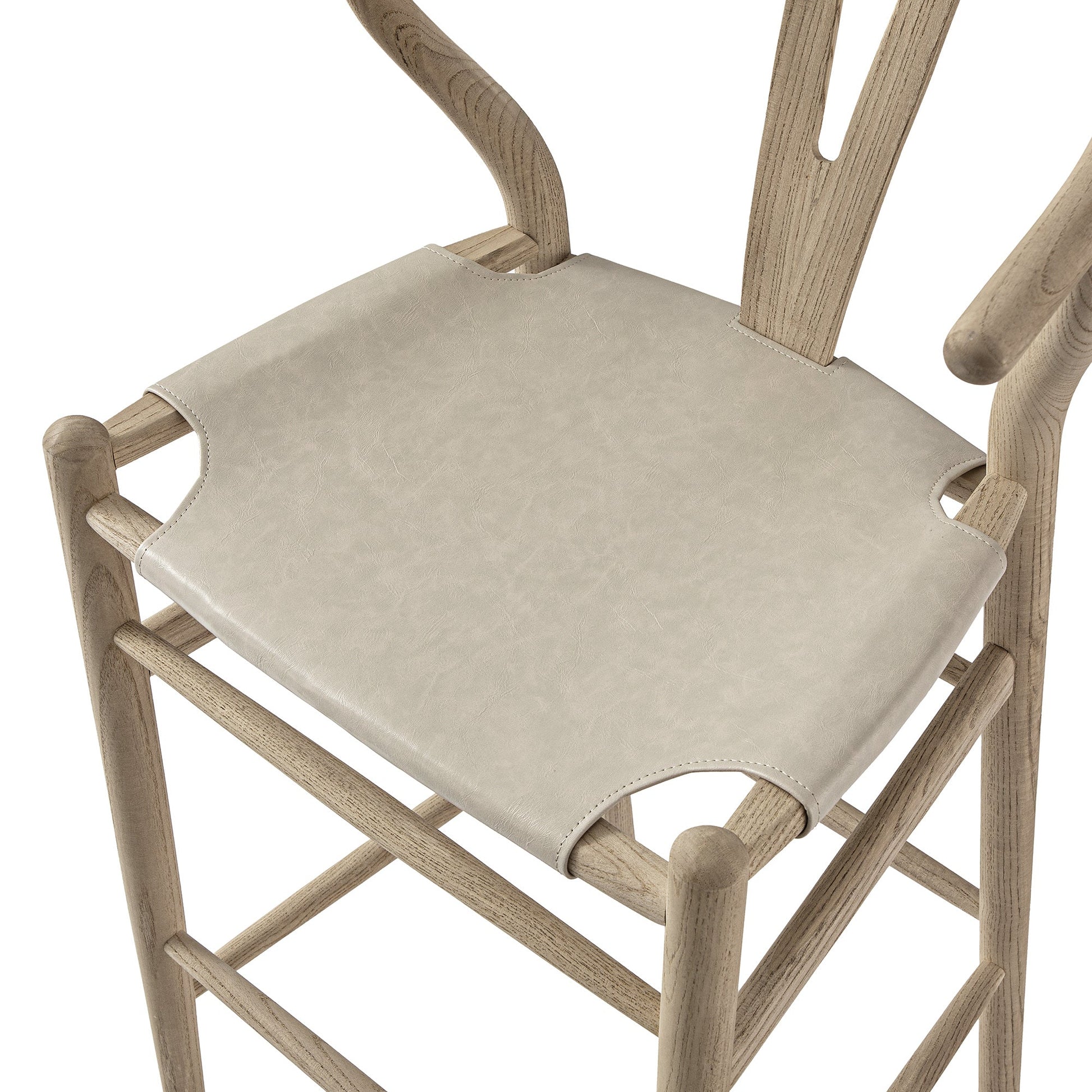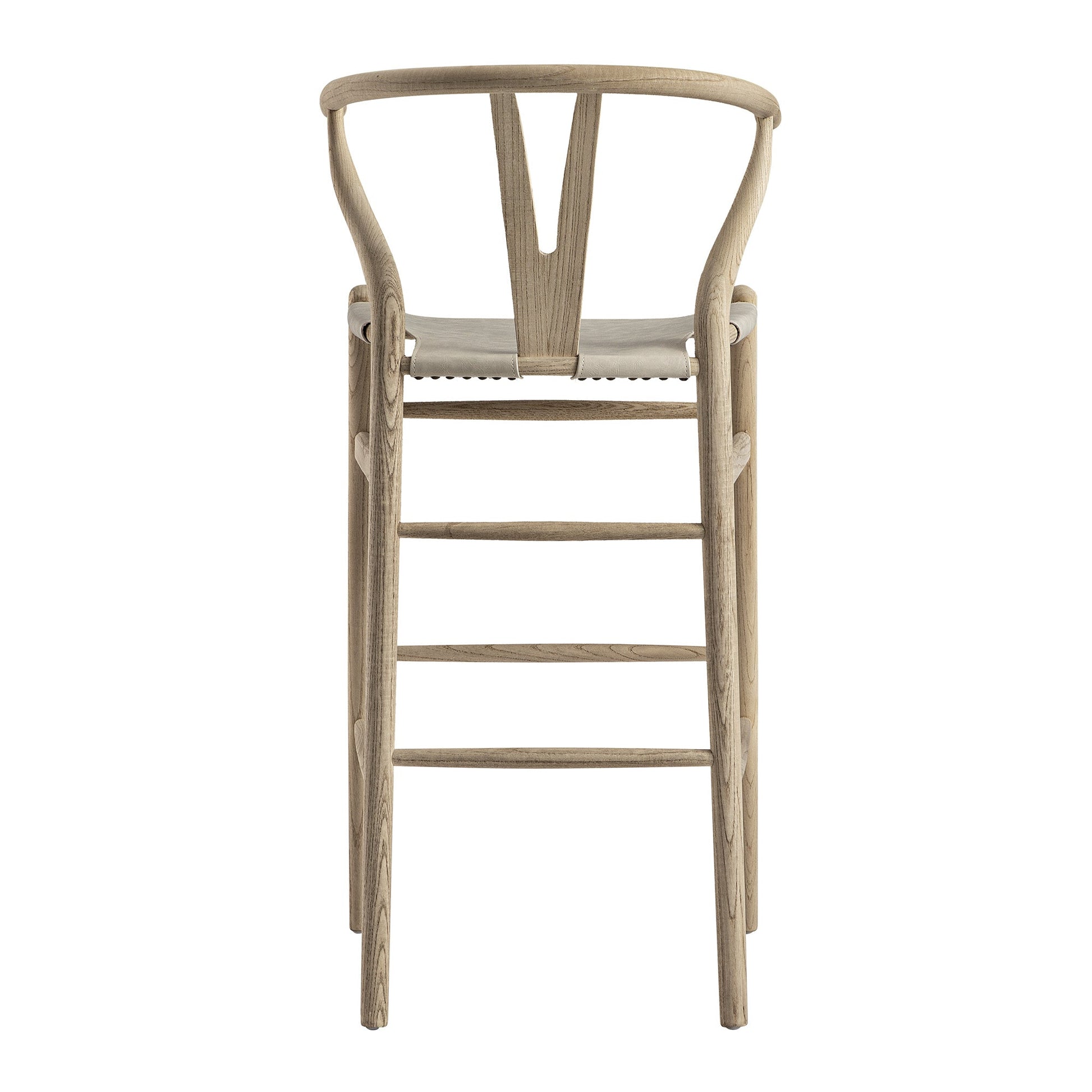 Tabouret de bar Hansel, structure en orme patiné et assise en similicuir gris clair