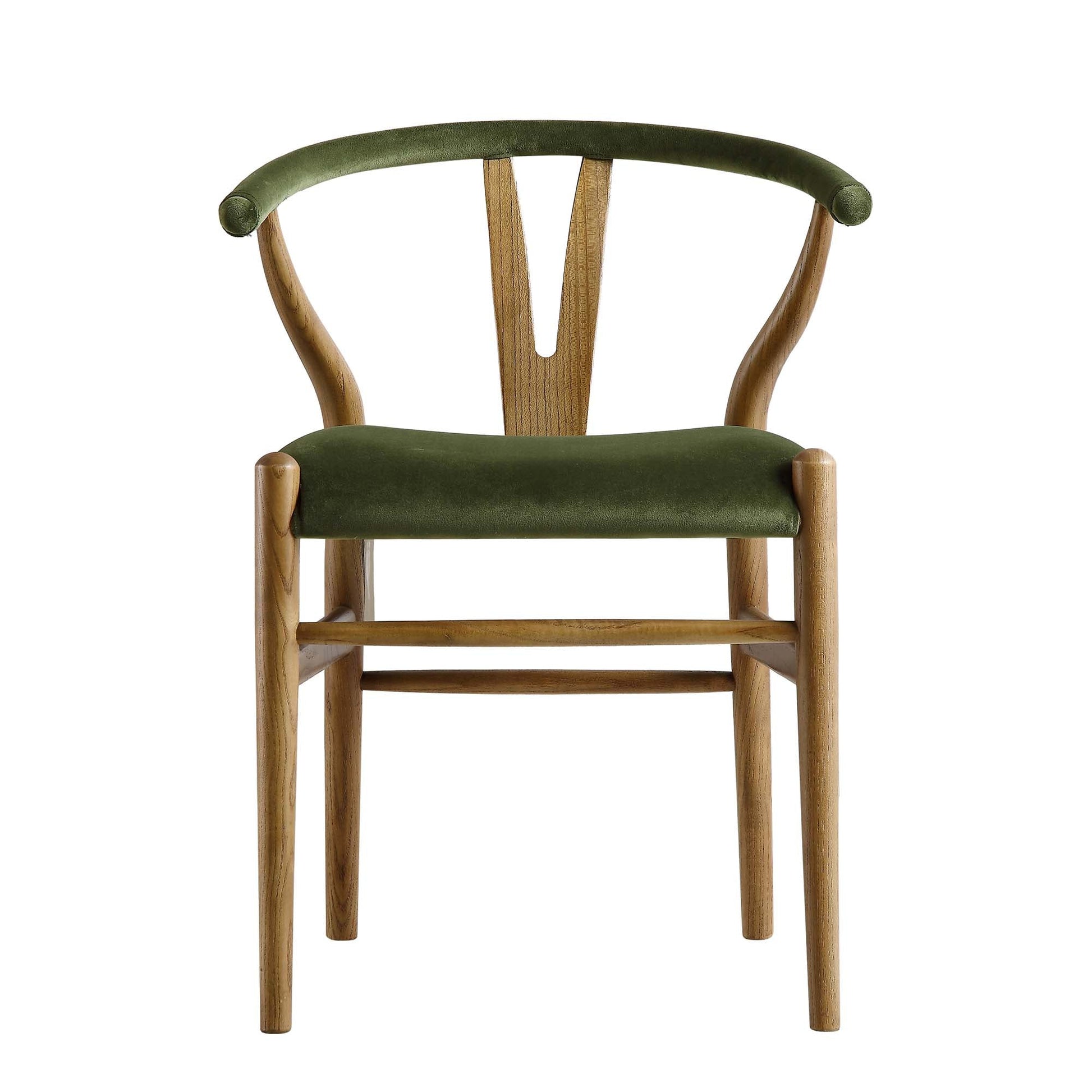 - Recouverte de velours vert mousse, la chaise est solidement fabriquée en bois d'orme massif avec une finition teintée couleur noyer clair.