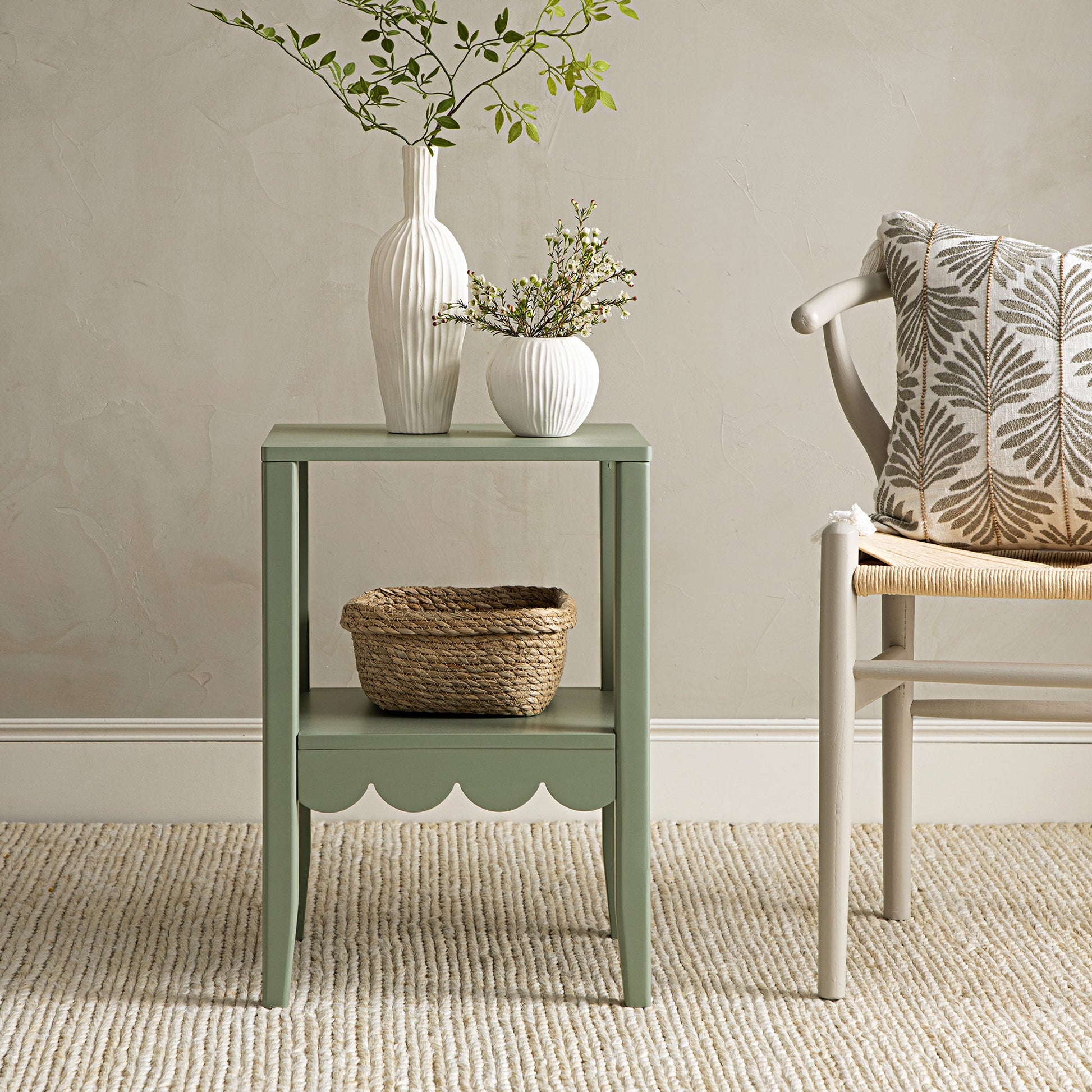 - Complétez le look : sur la photo avec la table d'appoint à bord festonné Henley, vert sauge, se trouve notre chaise de salle à manger en bois tissé naturel Hansel, cadre couleur taupe clair et coussin perlé brodé à la main Japonica de la collection Vine
