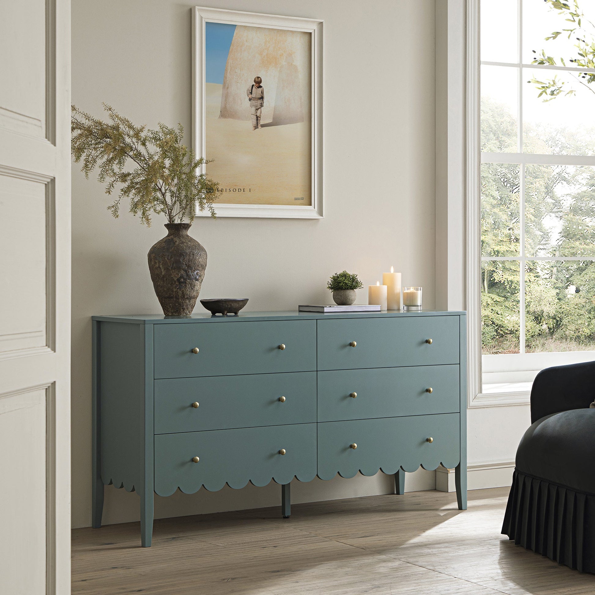 - Complétez le look : sur la photo avec notre commode à 6 tiroirs à bords festonnés Henley, vous trouverez notre fauteuil à jupe Calliope en velours bleu égéen.