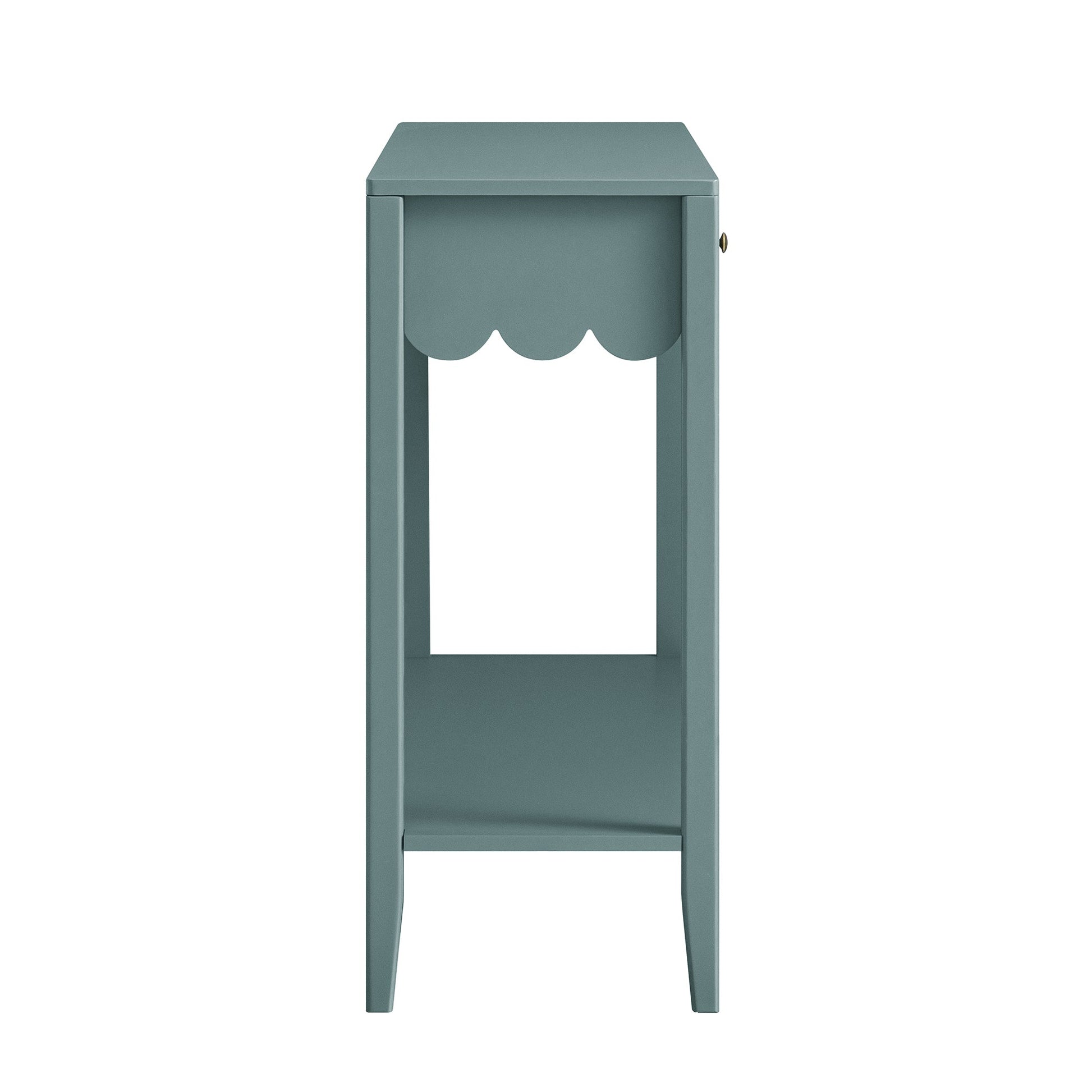 - Complétez le look : sur la photo avec notre table console à bords festonnés Henley, nous voyons notre tapis traditionnel en laine touffeté à la main Eden Blue Leaf et notre fauteuil à jupe Calliope en velours beige.