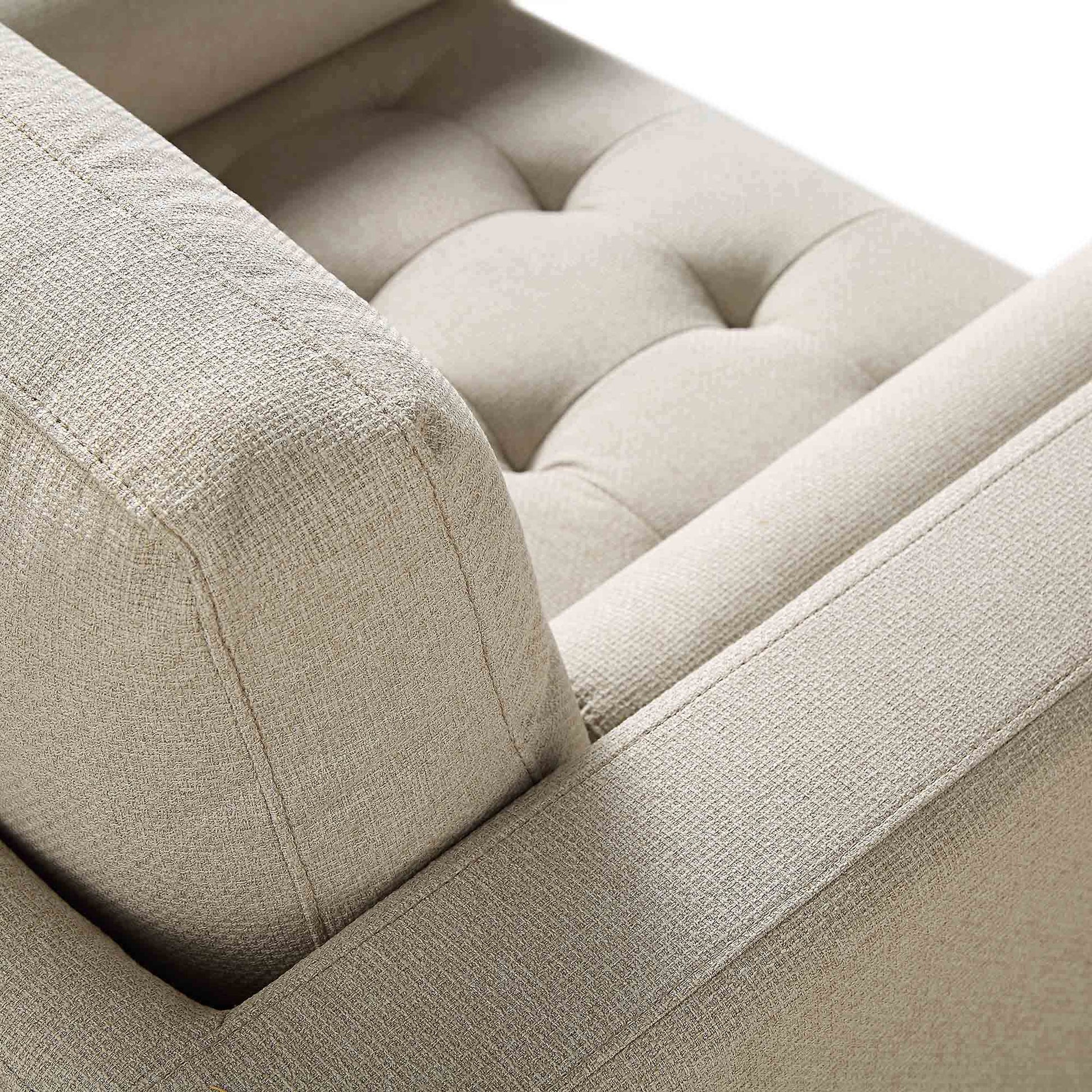 - Recouvert d'un beau tissu tissé beige facile à assortir à n'importe quel décor, assorti à des pieds en bois massif avec une finition teintée couleur noyer.