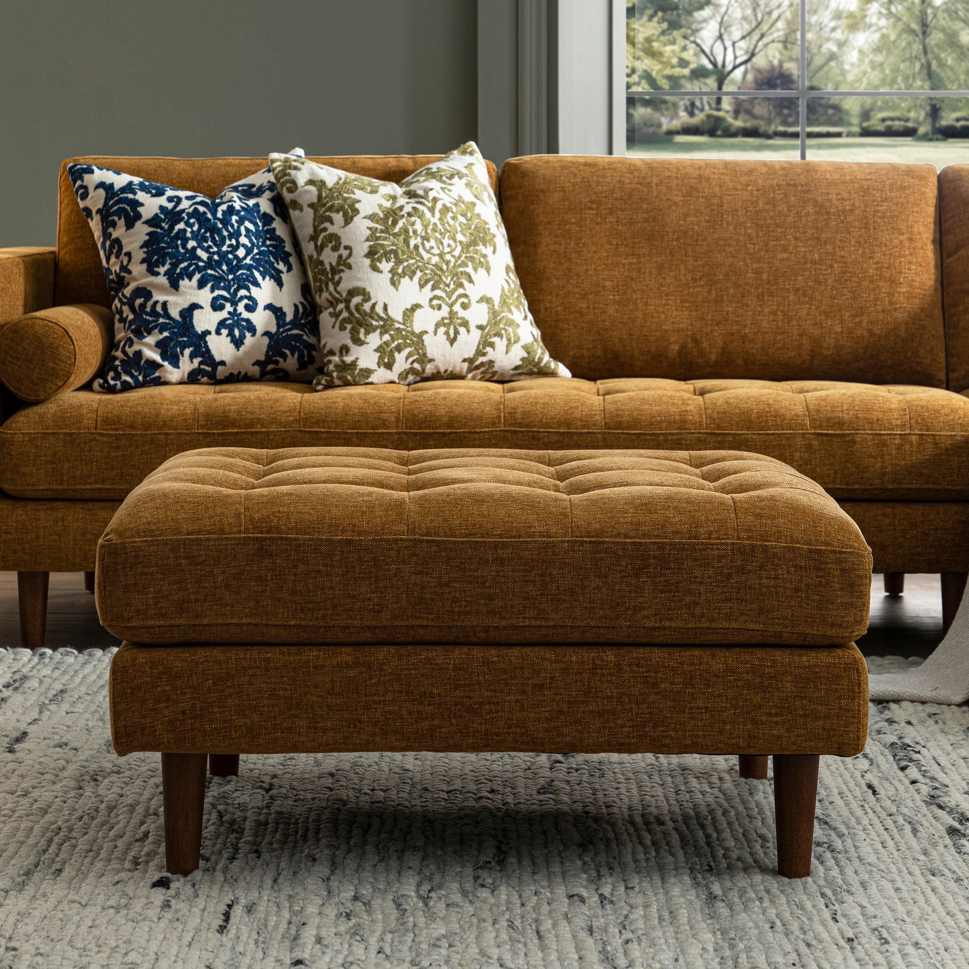 - Rembourré d'un magnifique tissu chenille couleur épices avec pieds en bois massif avec finition teintée couleur noyer.