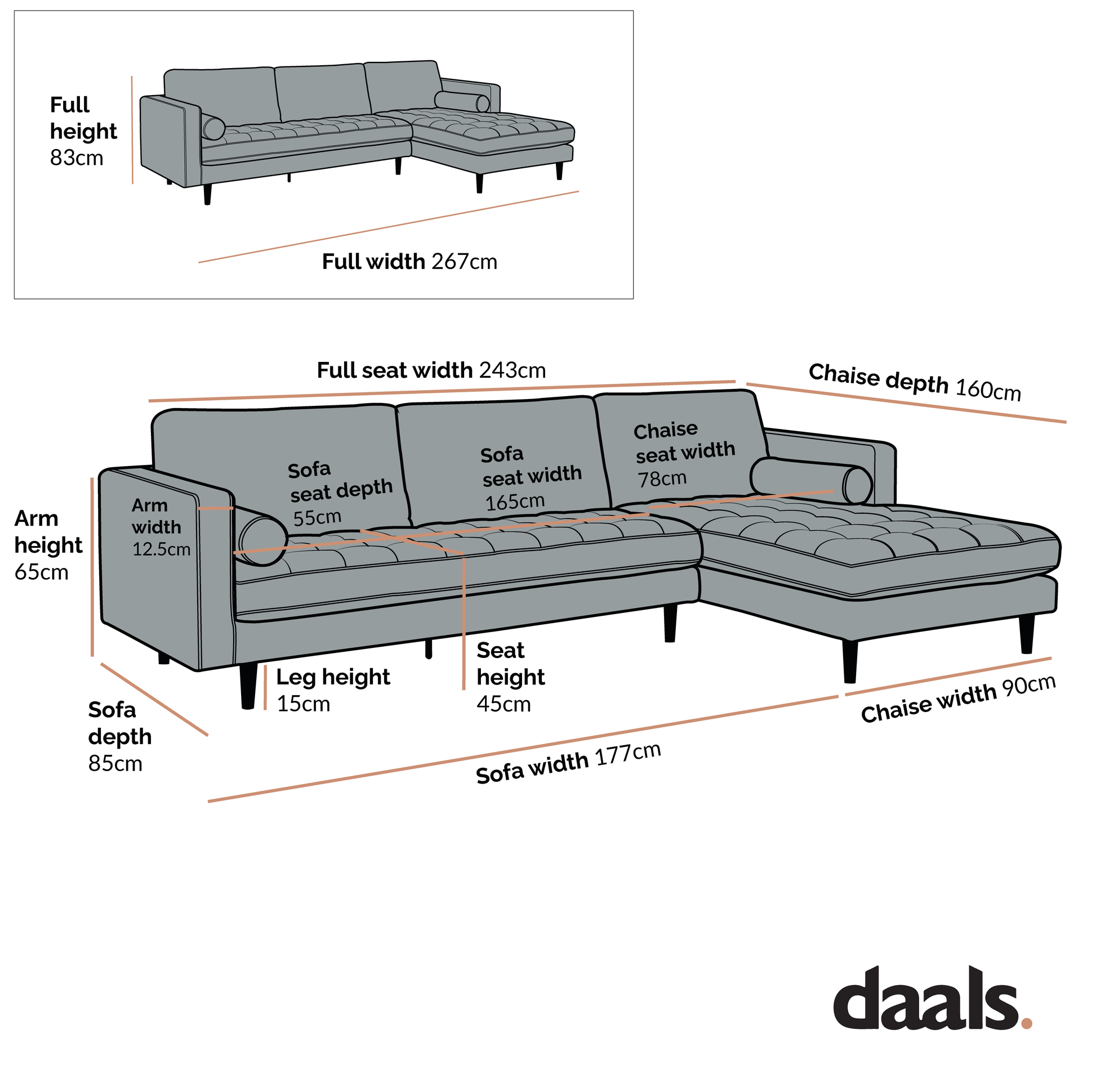 - Dimensions du canapé : L 267 x P 160 x H 83 cm.