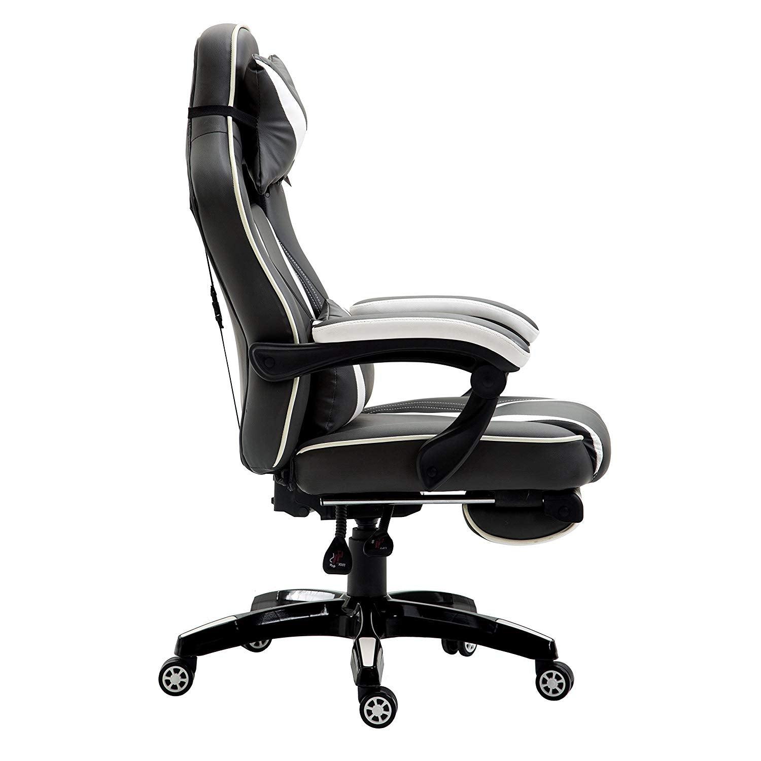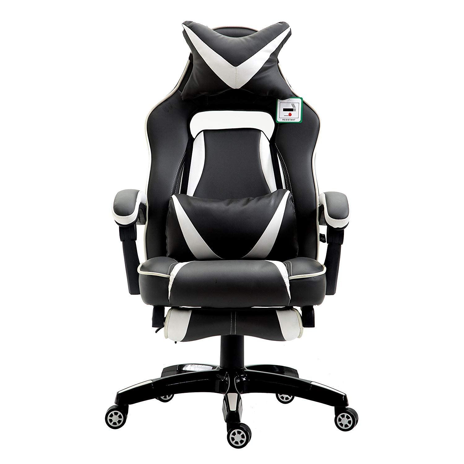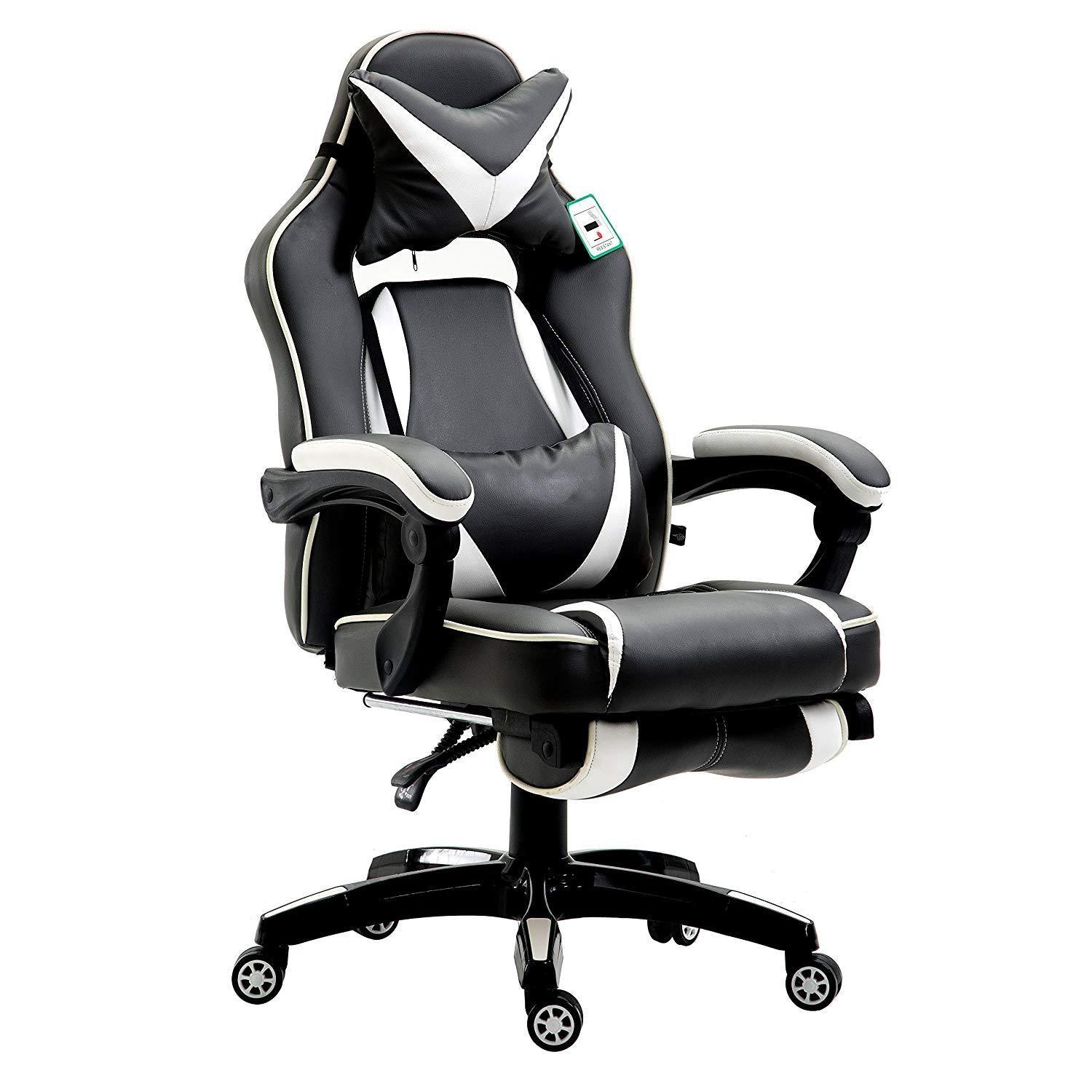 Fauteuil de jeu pivotant inclinable à dossier haut avec repose-pieds et coussin lombaire et de tête réglable, MR49 noir et blanc