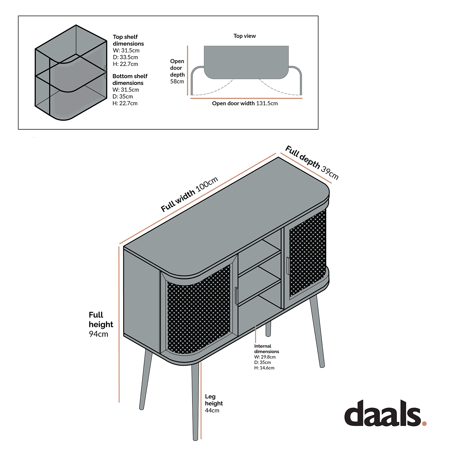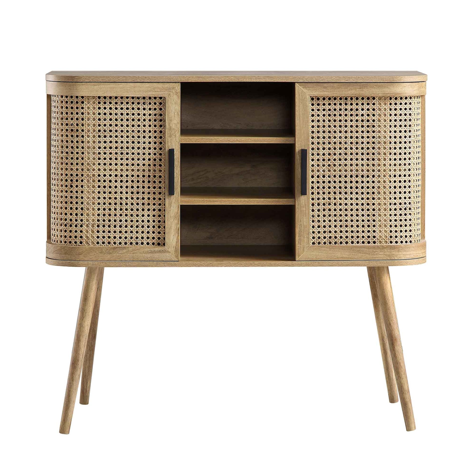 - Notre buffet Izzy présente un profil incurvé avec 2 portes en rotin.