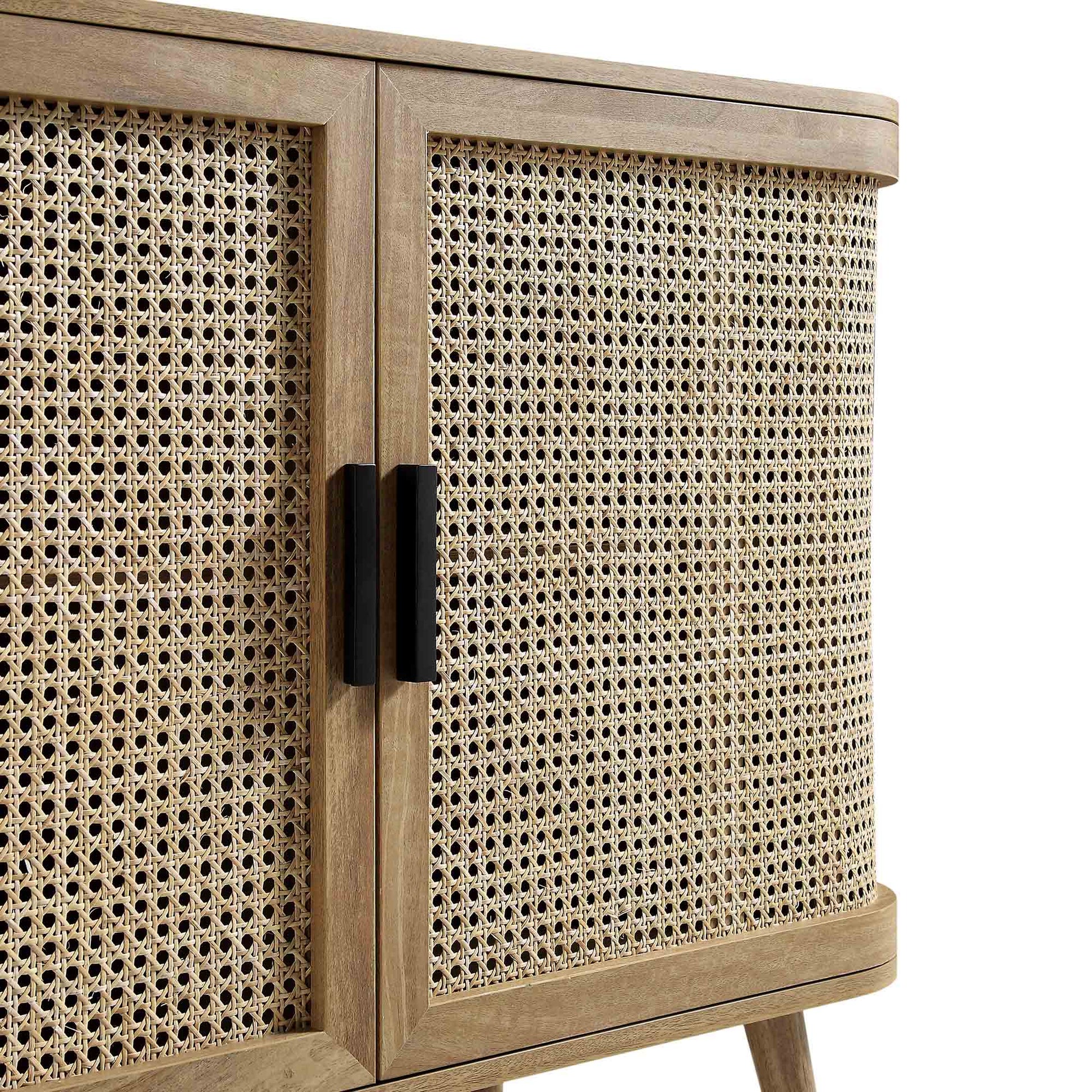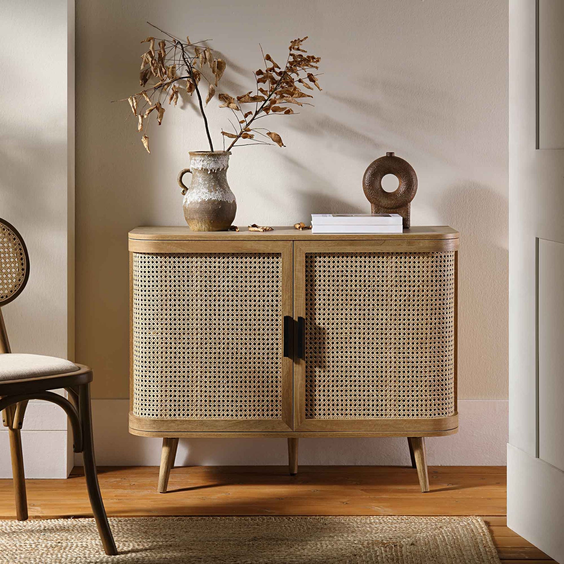- Notre petit buffet Izzy présente un profil incurvé avec 2 portes en rotin.