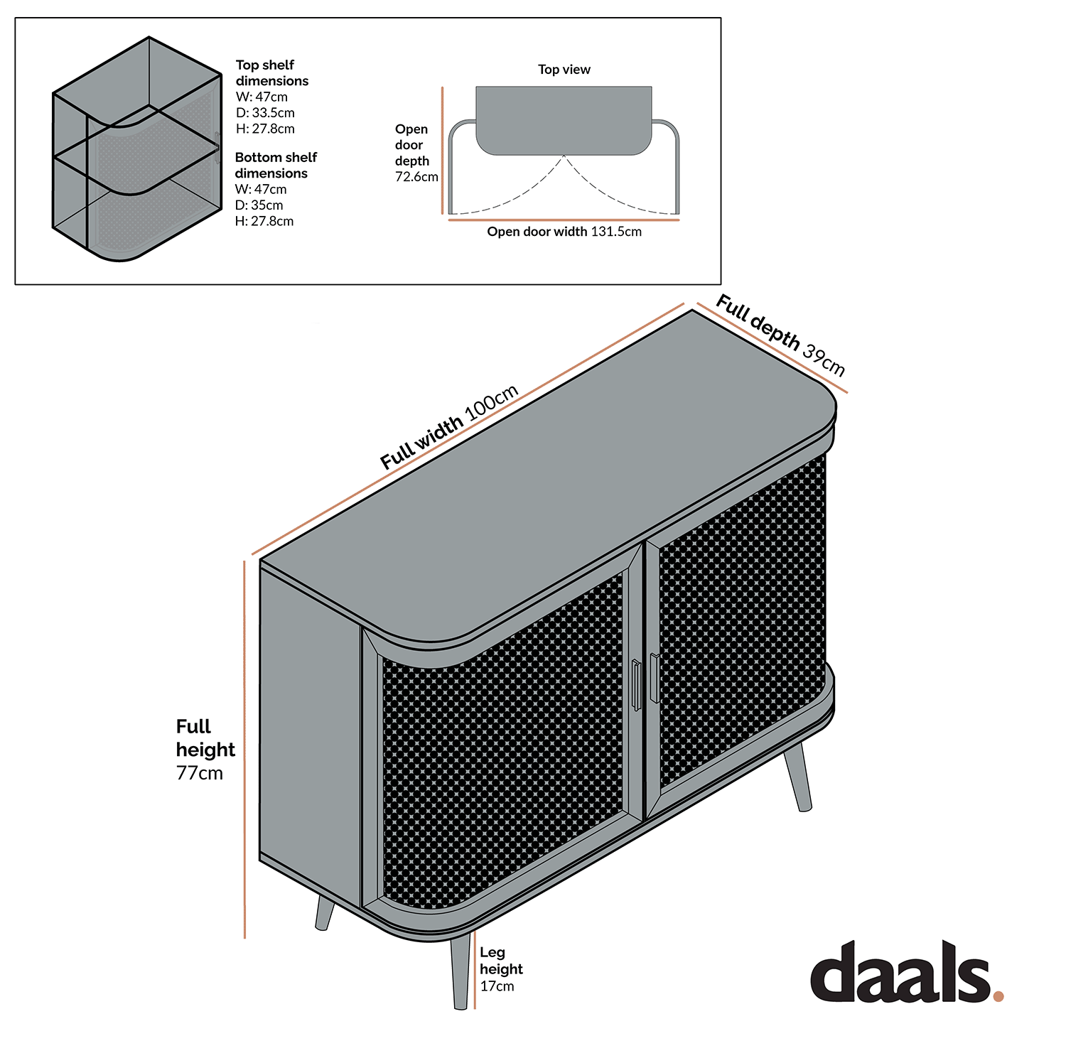- Notre petit buffet Izzy présente un profil incurvé avec 2 portes en rotin.