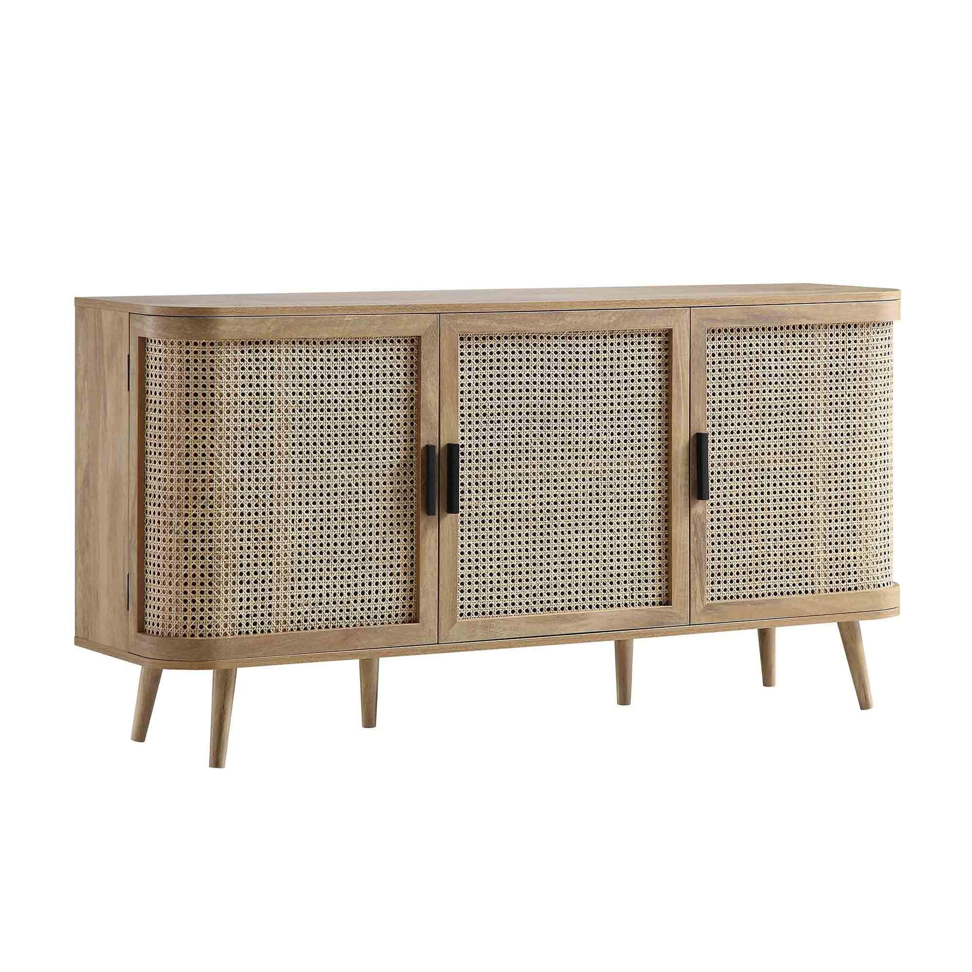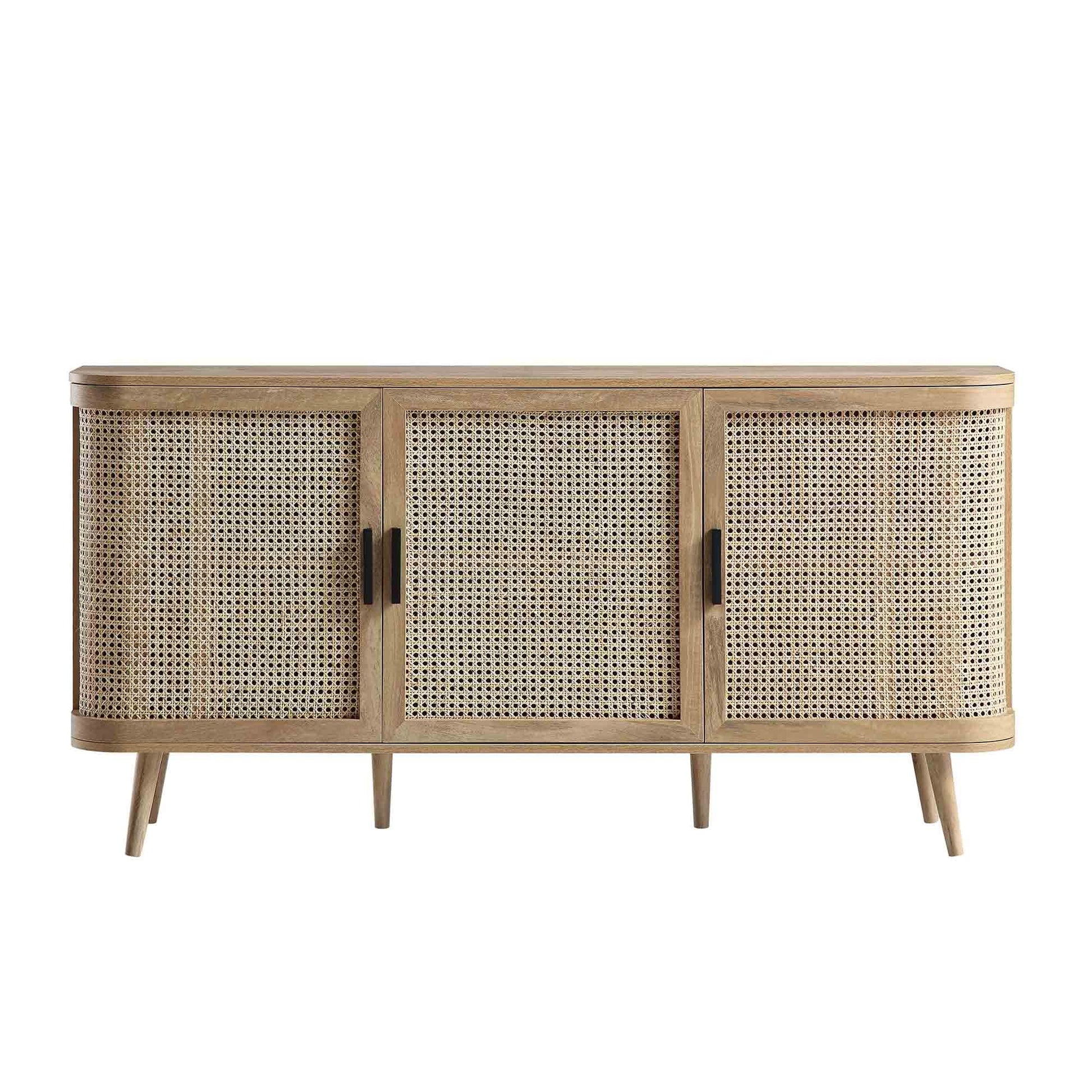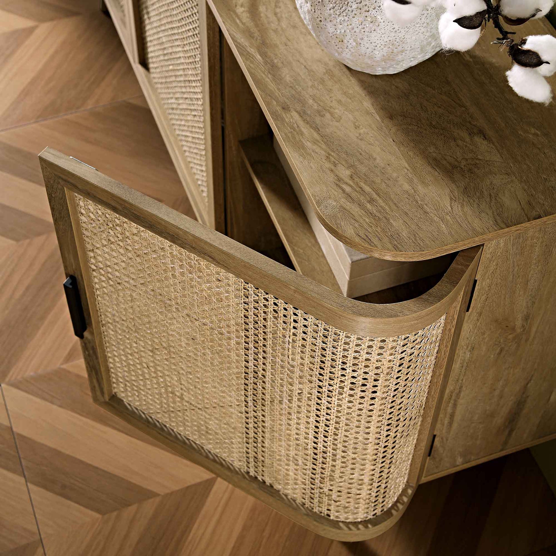 - Notre buffet Izzy présente un profil de bord arrondi avec des panneaux en rotin naturel pour un attrait aéré et doux.