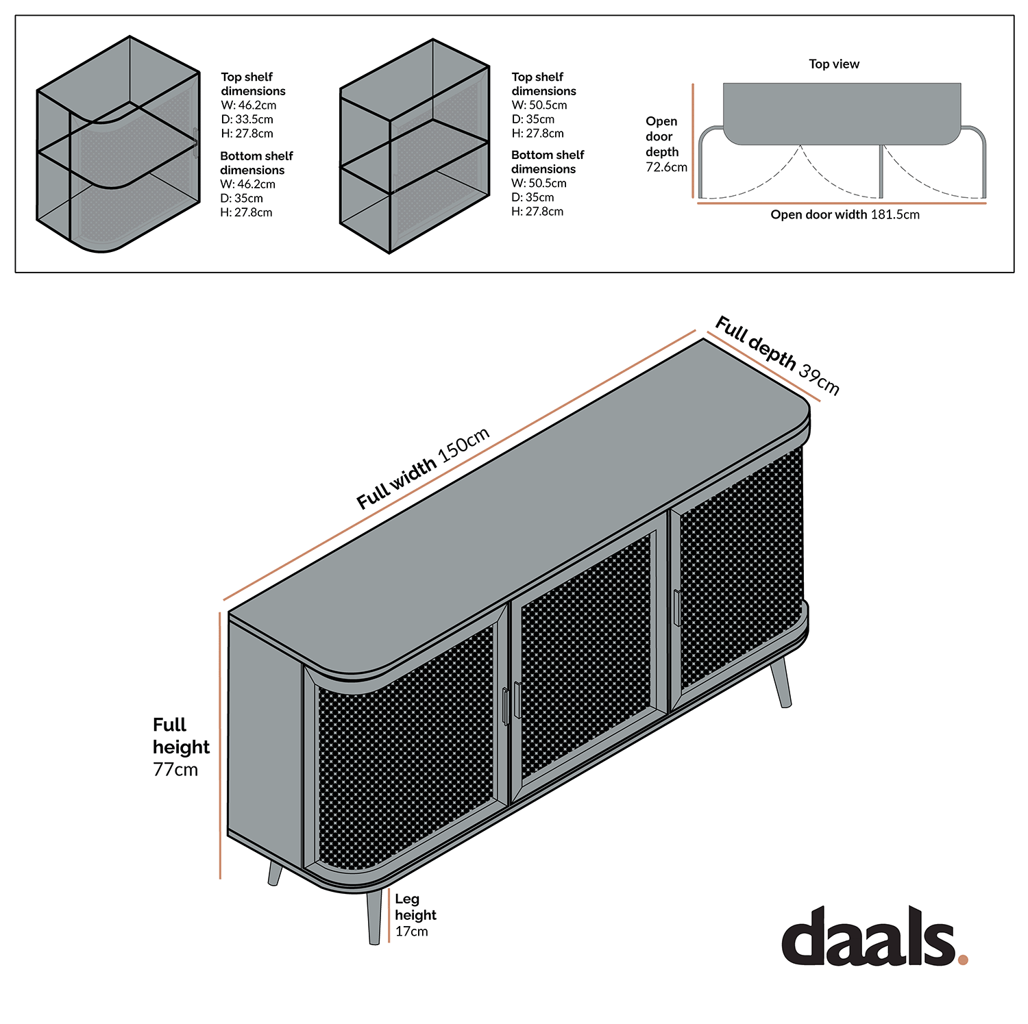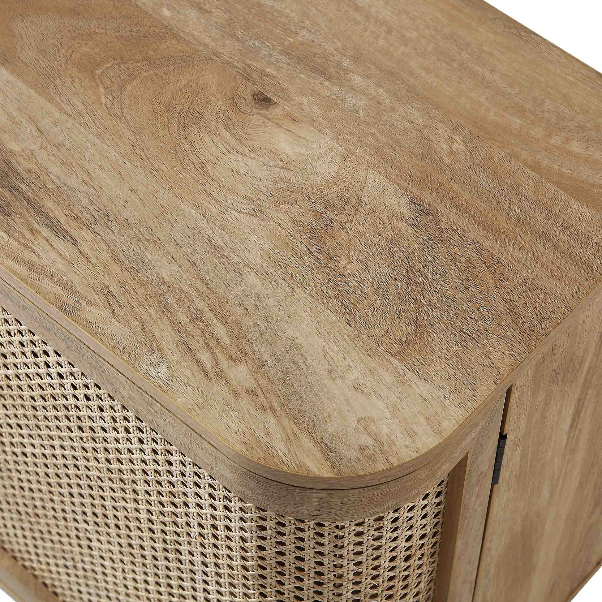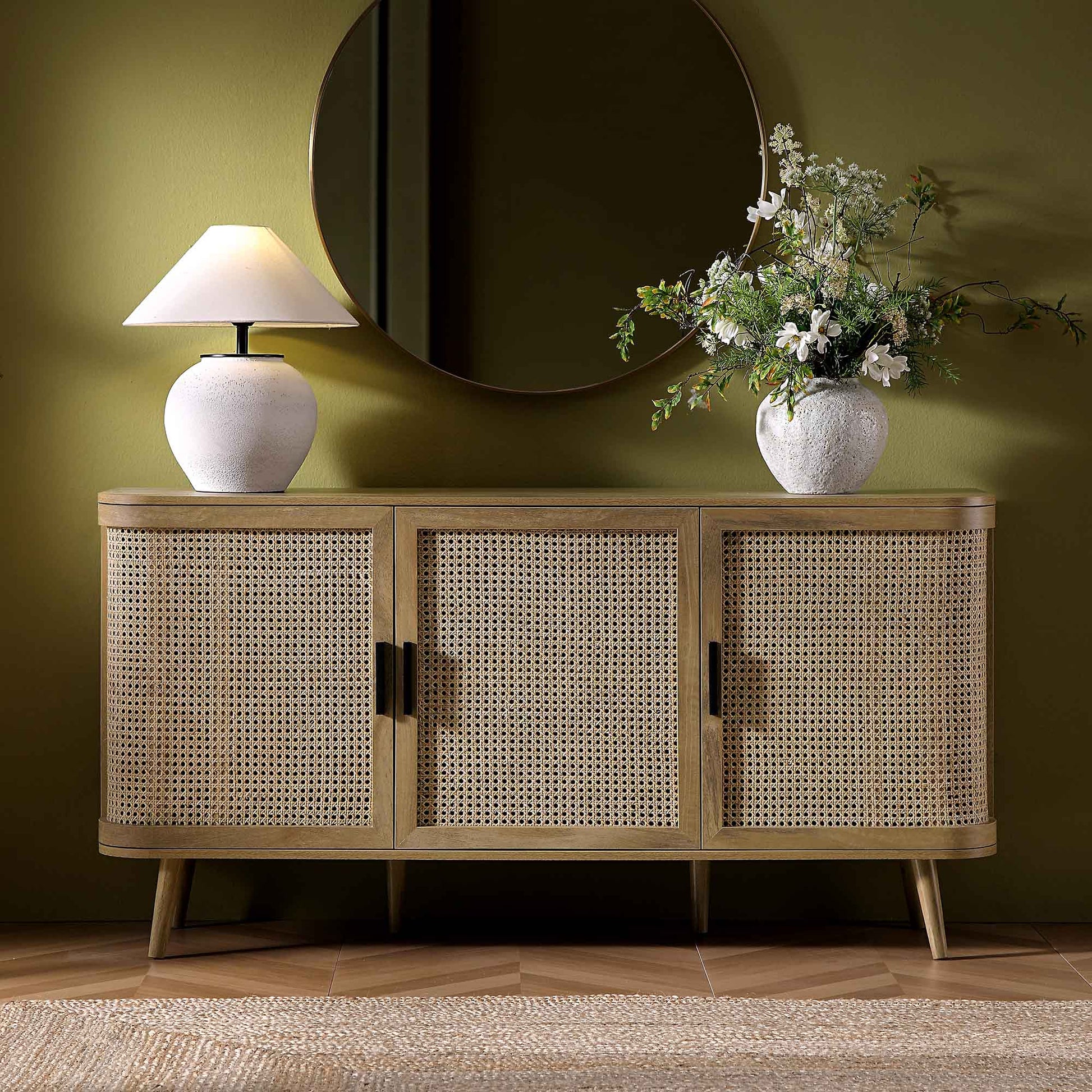 - Notre buffet Izzy présente un profil de bord arrondi avec des panneaux en rotin naturel pour un attrait aéré et doux.