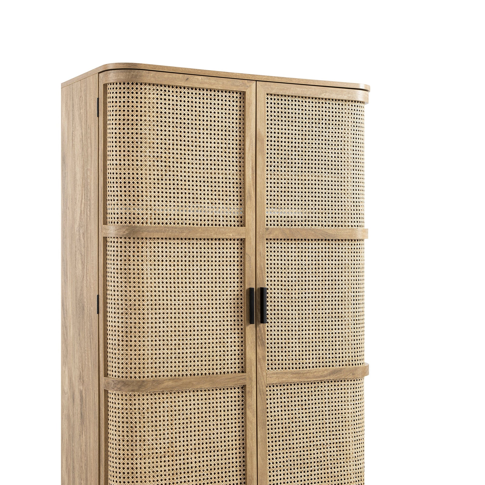 - Dotée d'une finition effet bois naturel et chaleureuse et encadrée par des courbes doucement sculptées, cette armoire présente des panneaux en rotin tissés à la main aérés qui apportent texture et légèreté au design.