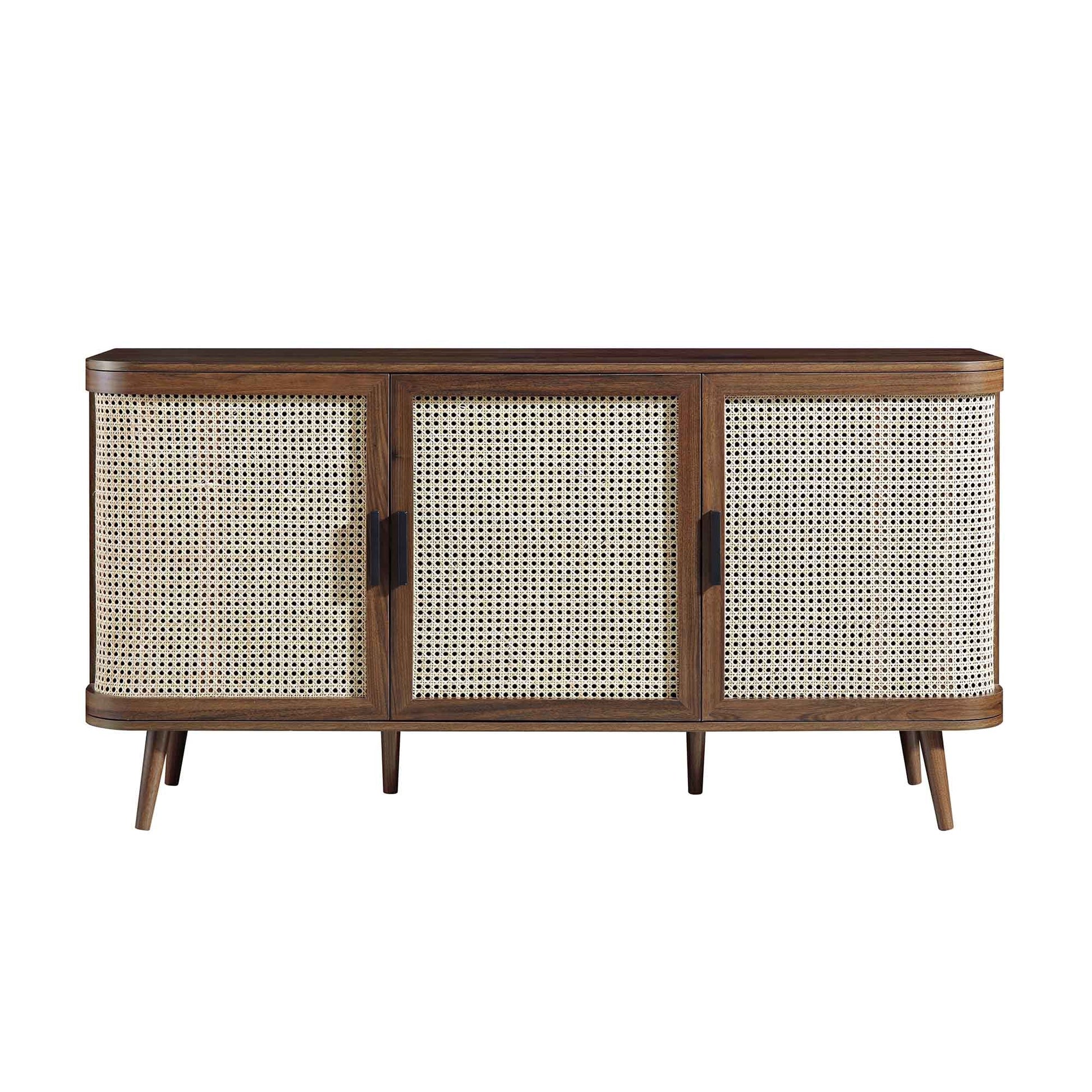 - Notre buffet Izzy présente un profil de bord arrondi avec des panneaux en rotin naturel pour un attrait aéré et doux.