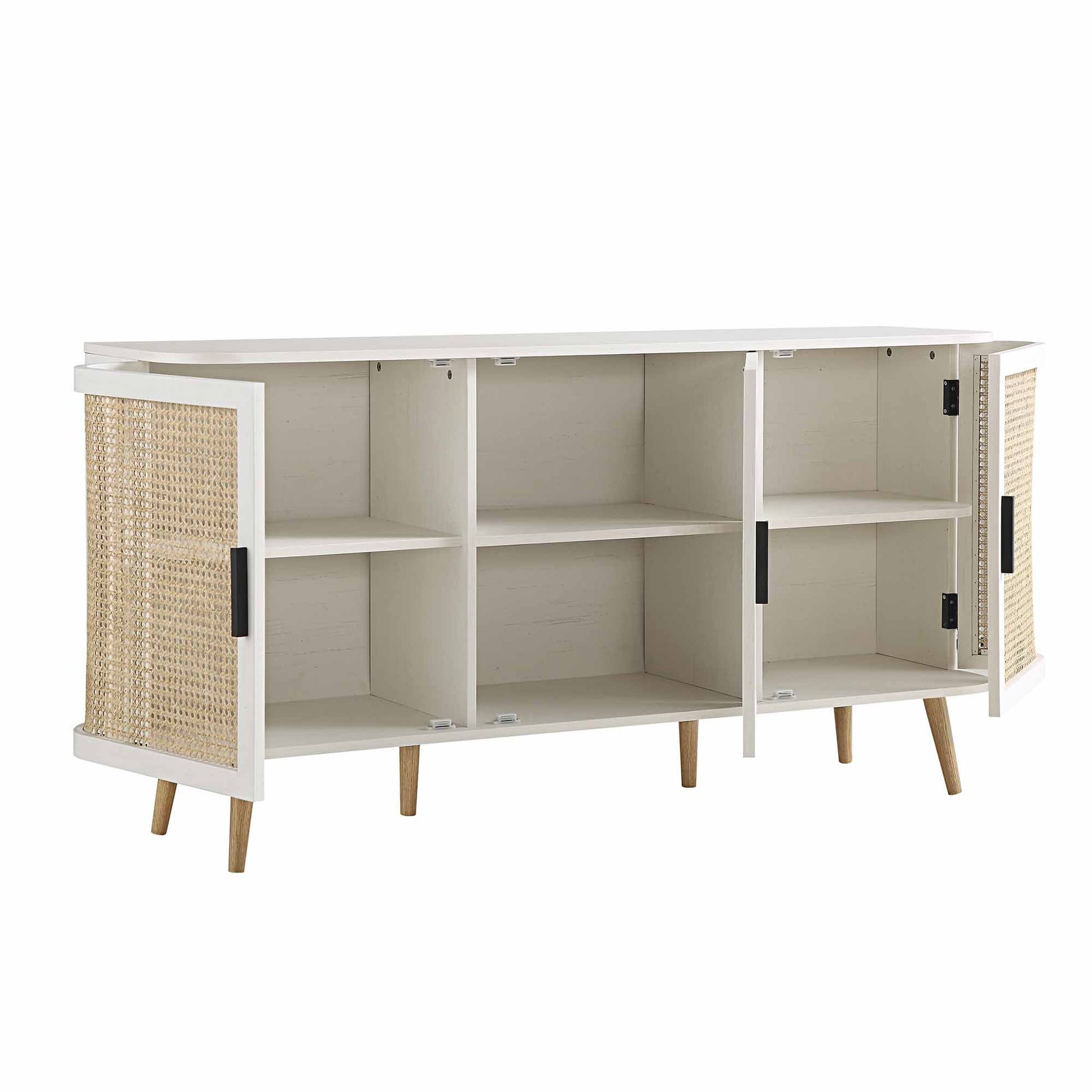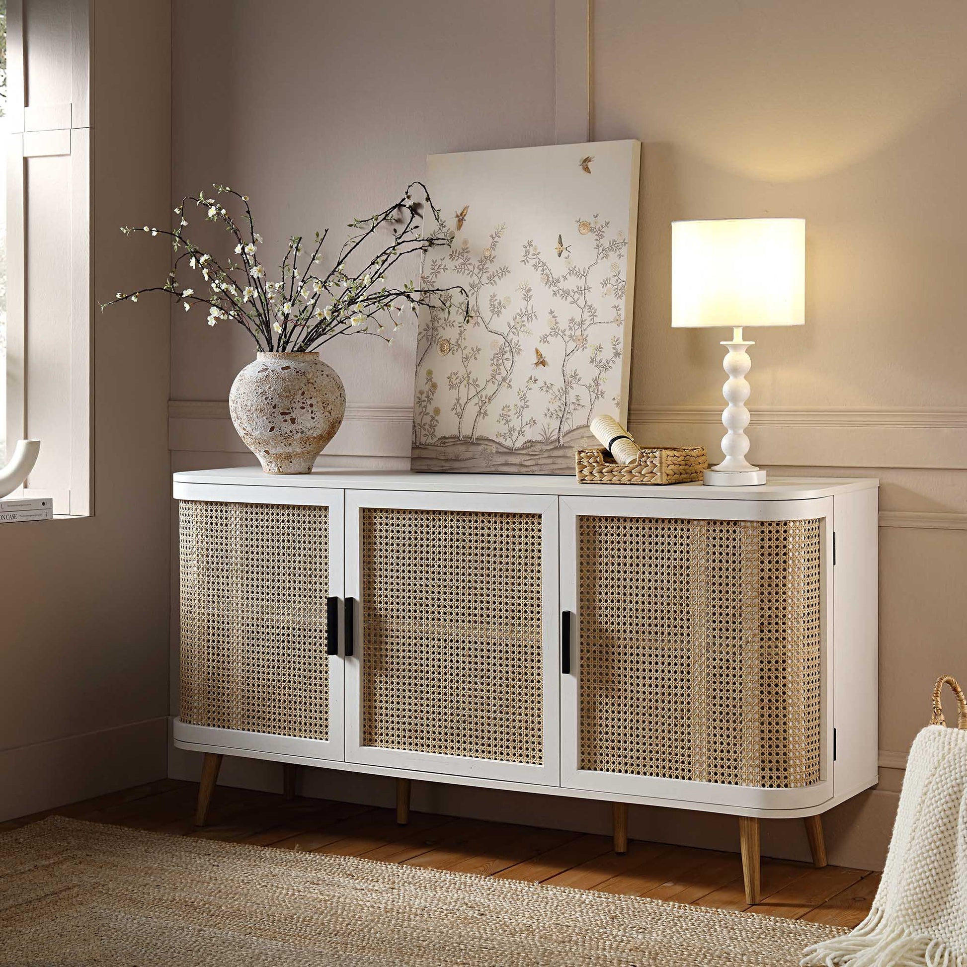 - Notre buffet Izzy présente un profil de bord arrondi avec des panneaux en rotin naturel pour un attrait aéré et doux.