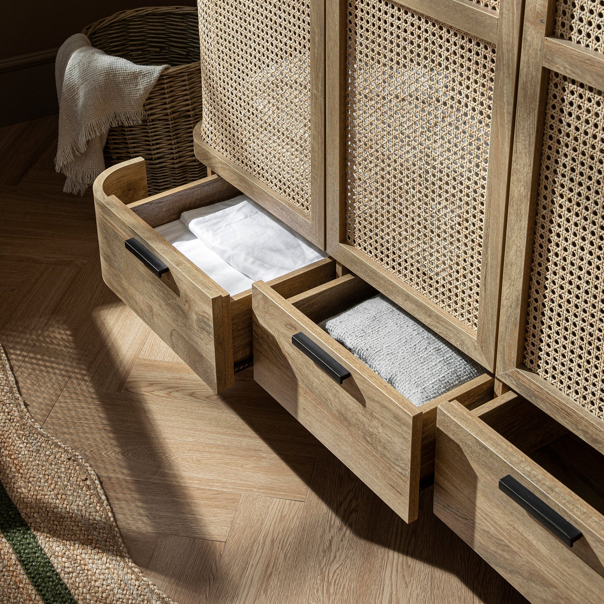 - Magnifiquement conçue pour ceux qui ont besoin de plus de rangement sans compromettre le style, l'armoire triple en rotin incurvé Izzy en naturel est une pièce remarquable pour n'importe quelle chambre.