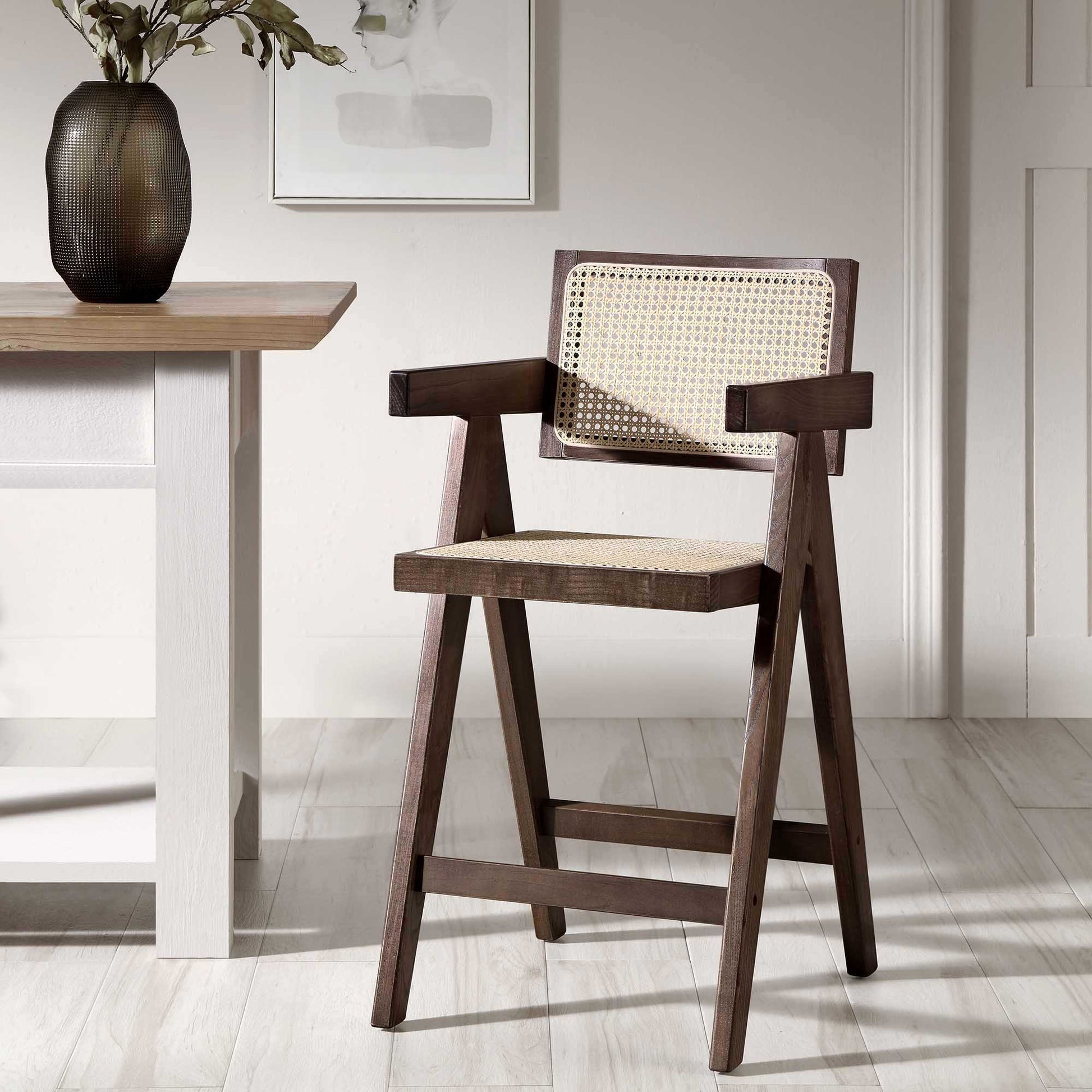 Tabouret de bar Jeanne en noyer foncé, rotin et hêtre massif