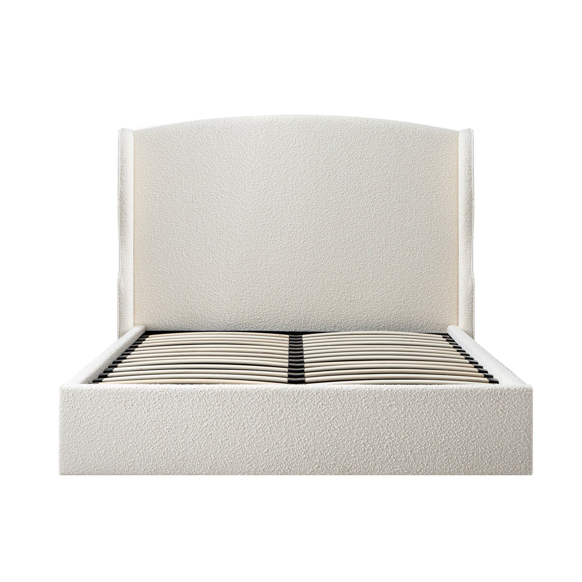 - Magnifiquement tapissé de la tête de lit haute jusqu'au pied de lit avec un tissu bouclé écru pour un look contemporain.