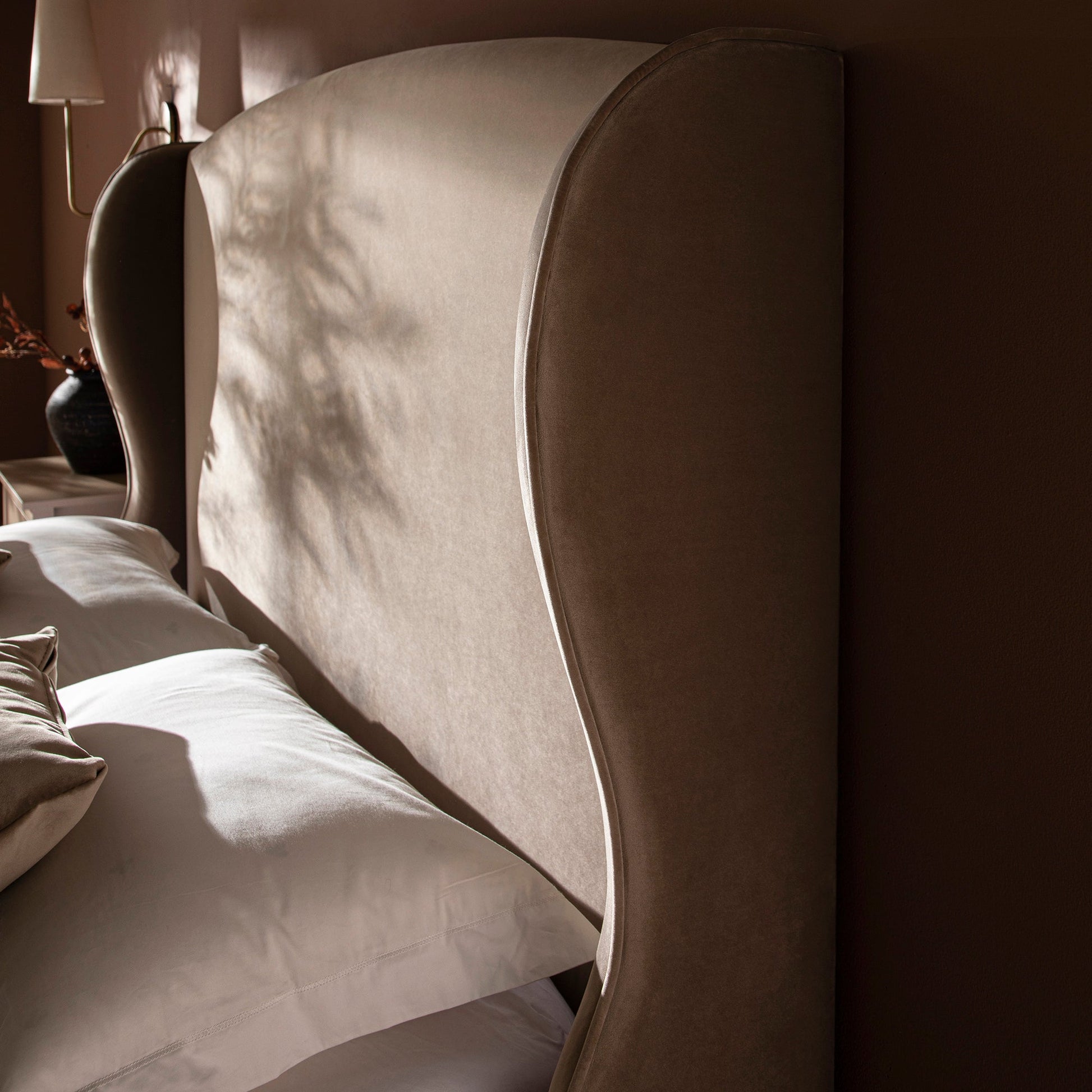 - Magnifiquement tapissé de la tête de lit haute jusqu'au pied de lit avec un riche tissu au toucher velours taupe.