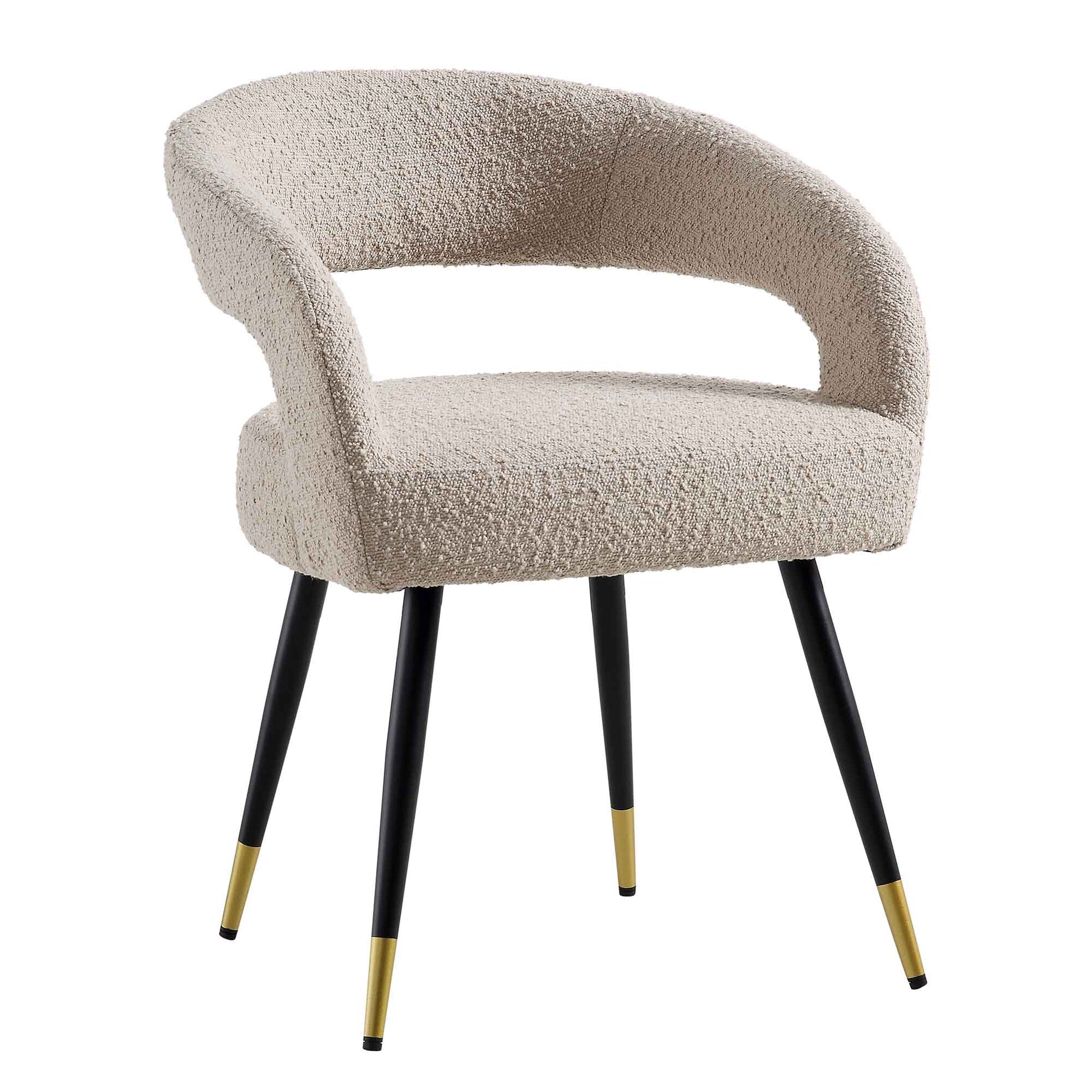- Le dossier incurvé découpé s'intègre parfaitement aux accoudoirs et à l'assise, associé à des pieds légèrement effilés avec une pointe dorée pour un look élégant.