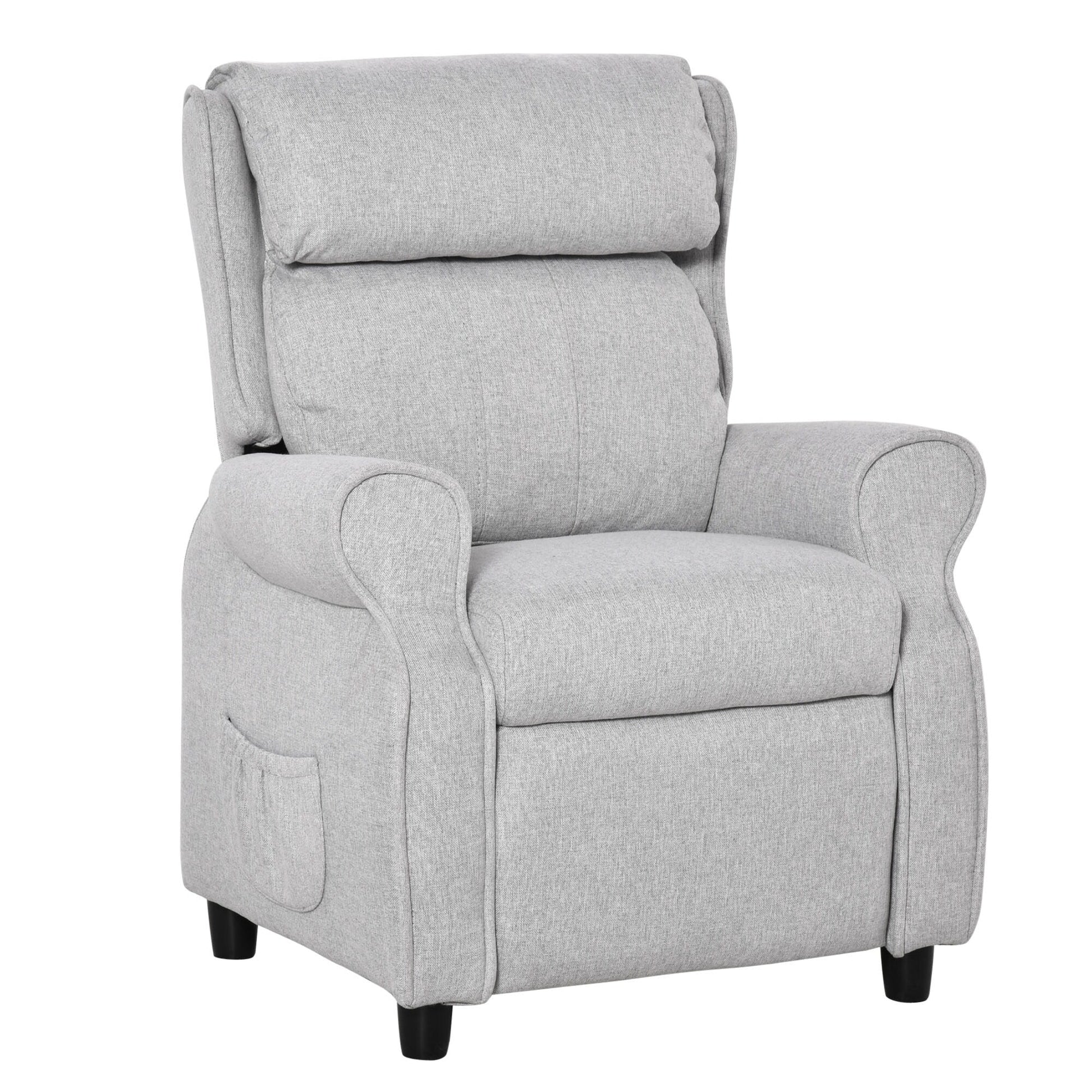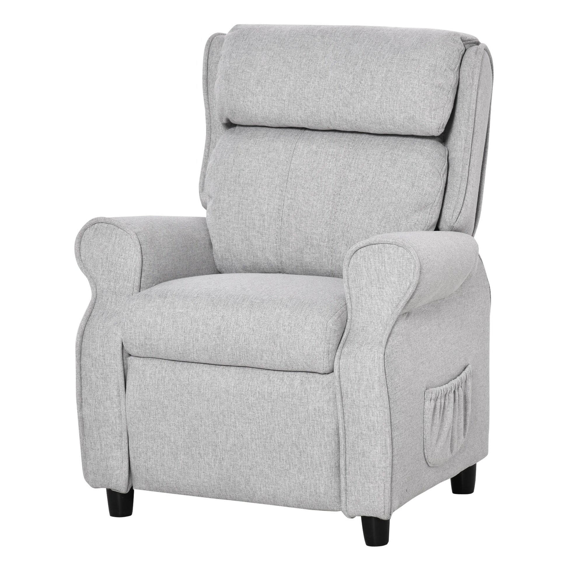 Fauteuil inclinable manuel rembourré gris clair pour enfants de 3 à 5 ans, avec repose-pieds et 2 poches latérales