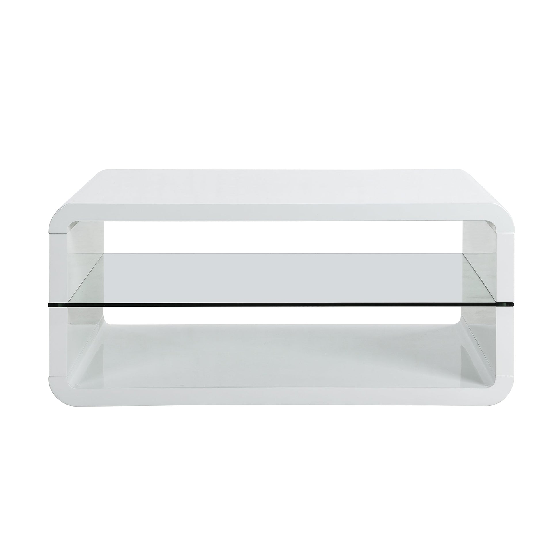 - Notre table basse Lucent donne à votre salon/séjour une sensation aérée et douce grâce à sa finition blanche brillante, ses coins arrondis et son étagère en verre transparent.
