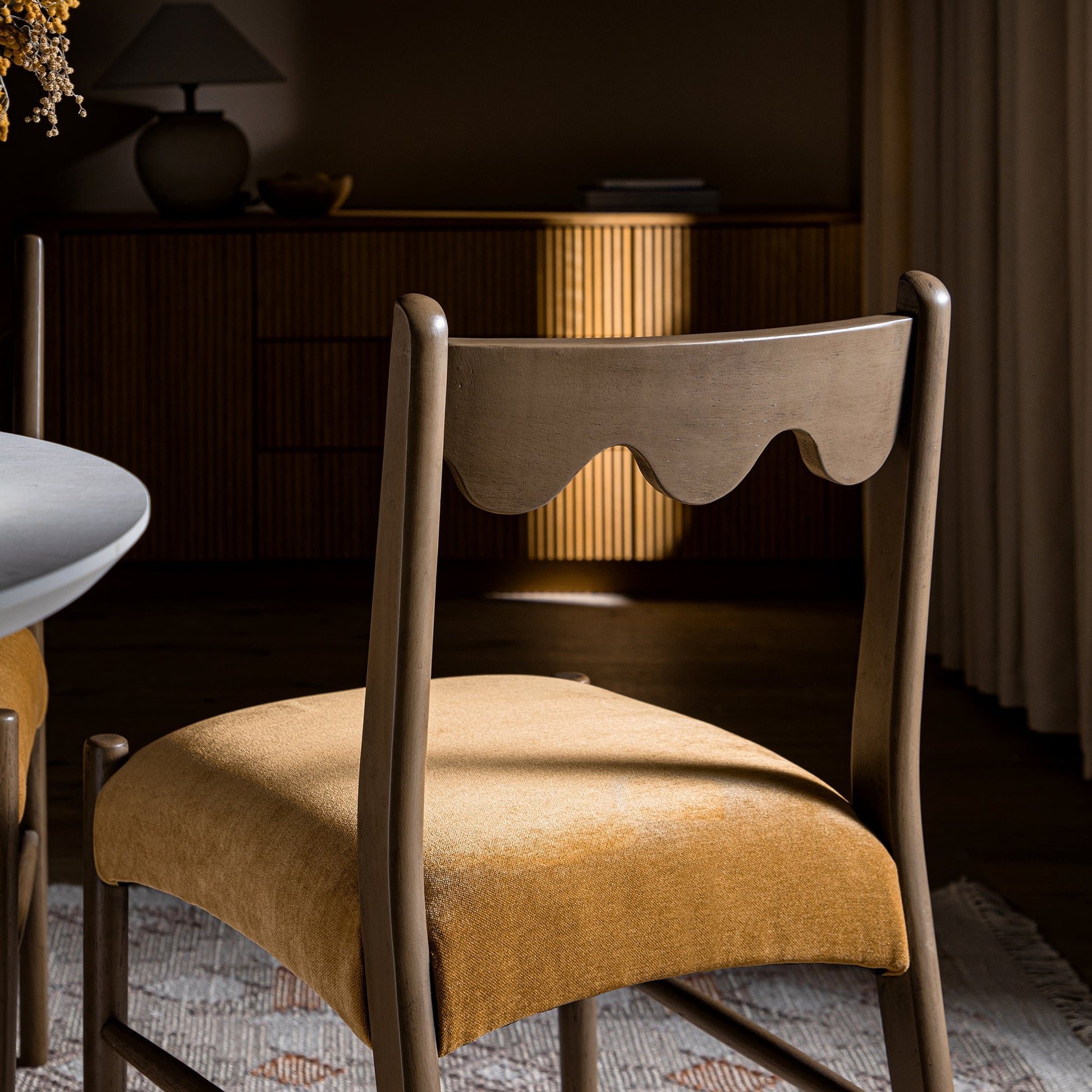 - Une version chaleureuse d'un classique sculptural, la chaise de salle à manger Ludlow en magnifique tissu chenille ton moutarde apporte richesse et charme à votre espace.