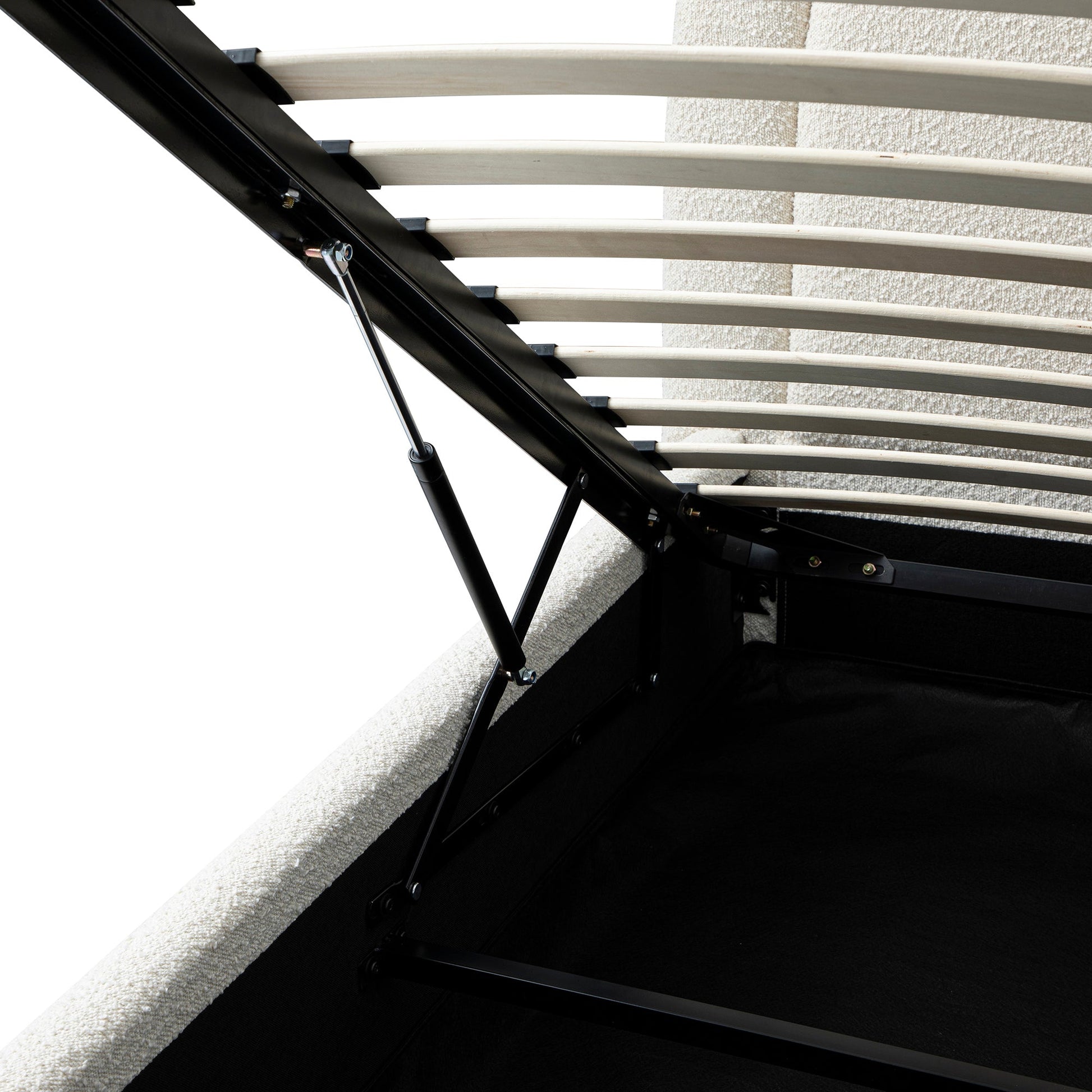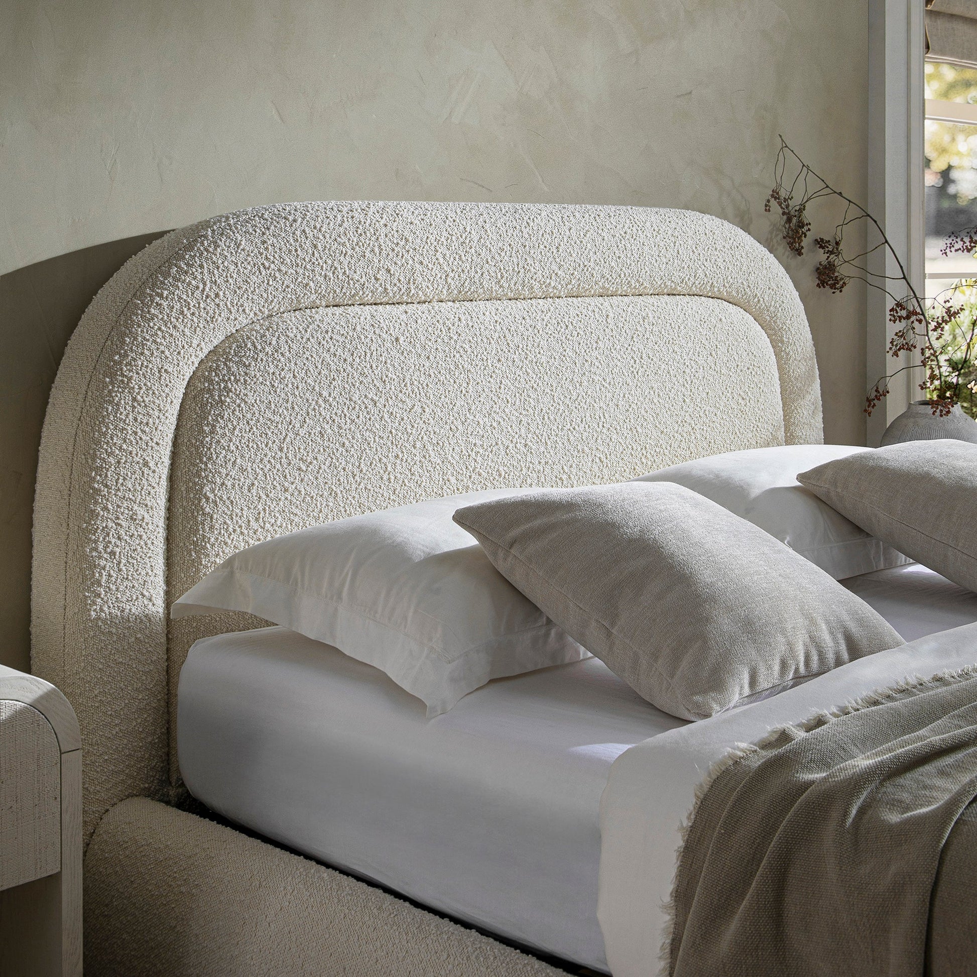 - Complétez le look : sur la photo avec le lit de rangement rembourré Luella Ecru Boucle se trouvent notre table de chevet en raphia blanc délavé Maude , le tapis en laine tissé à la main Atlan crème et noir et la chaise d'appoint en chêne vieilli Chinnor beige Boucle .